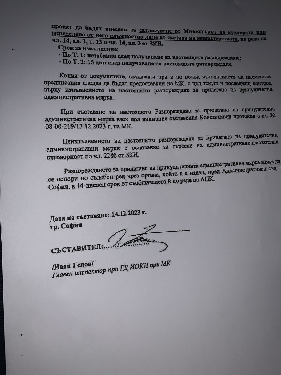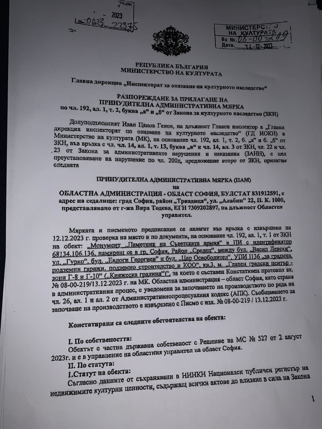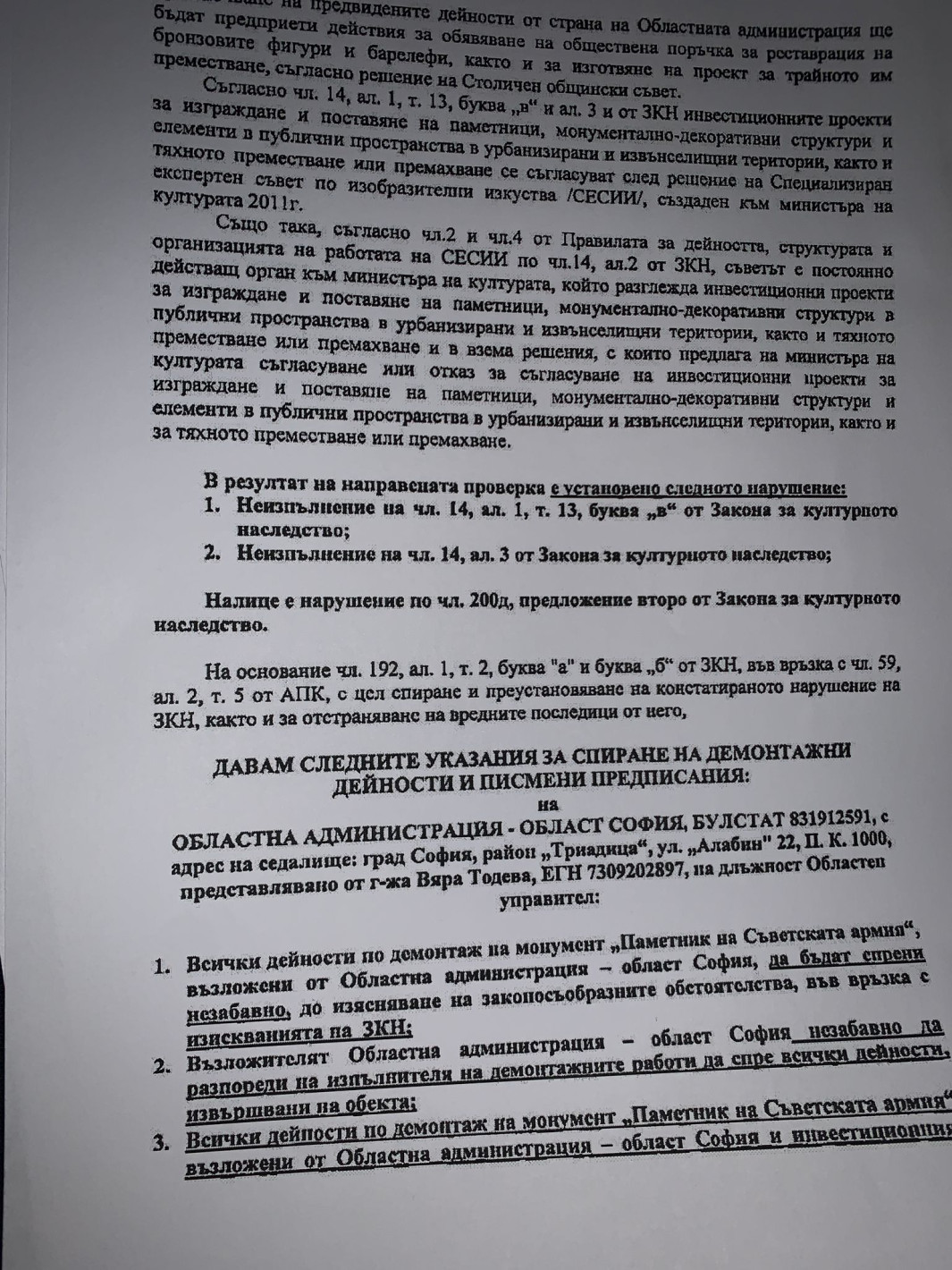 Министерството на културата е разпоредило на 14 декември незабавно да спре демонтирането на фигури от Паметника на Съветската армия. Това става ясно от факсимиле на документ, публикувано от сайта "Гласове". Главният инспектор към "Главна дирекция инспекторат по опазване на културното наследство Иван Цанов Генов е наредил на Областната администрация - област София незабавно да преустанови дейностите по паметника. Като основание той е посочил нарушение на чл. 14, ал. 1 и 3 от Закона за културното наследство, както и по чл. 200д, предложение второ от Закона за културното наследство.