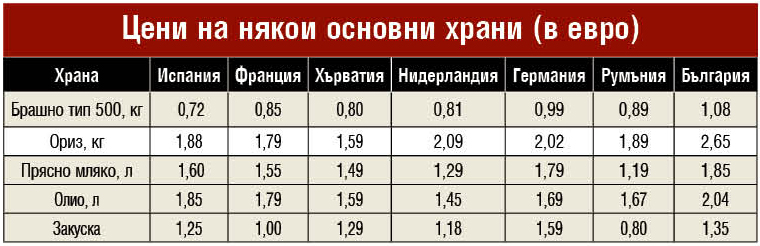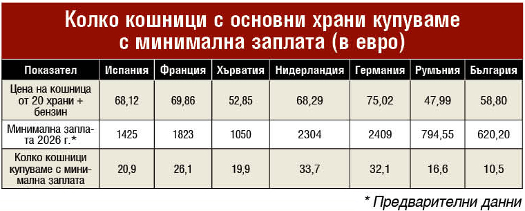В България цената на кошница с 20 основни храни плюс бензина е 58,80 евро, показват данни на КНСБ. Основните храни в България са по-скъпи, отколкото в Хърватия и Румъния. Цената на същата кошница с основни стоки в Хърватия е 52,85 евро, а в Румъния е 47,99 евро. В същото време заплатите в тези страни са по-високи. В България минималната заплата е 620,20 евро и с нея може да бъдат купени 10,5 кошници с основни храни и бензин. В Румъния с минималната заплата може да бъдат купени 16,6 кошници, а в Хърватия 19,9 кошници. Хората с минимална заплата в Испания, Франция, Нидерландия и Германия живеят още по-добре. С минималната заплата във Франция хората могат да купят 26 кошници с храни, а в Германия 32 кошници. По цени сме стигнали останалите държави от ЕС, при някои дори сме ги минали, но не е така при заплатите, коментира Любослав Костов, главен икономист на КНСБ.