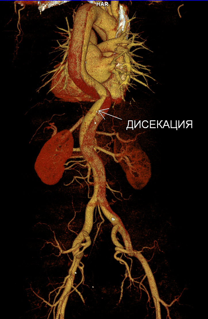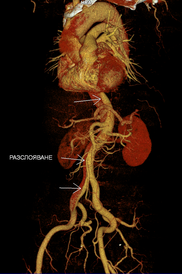 Пациентът моментално е предложен за операция по спешност. Специалистите установяват, че аортата му е разслоена от началния й сегмент, произлизащ от сърцето, до най-периферните й разклонения на десния крак с две дисекационни разкъсвания в областта над корена на аортата и аортната дъга.