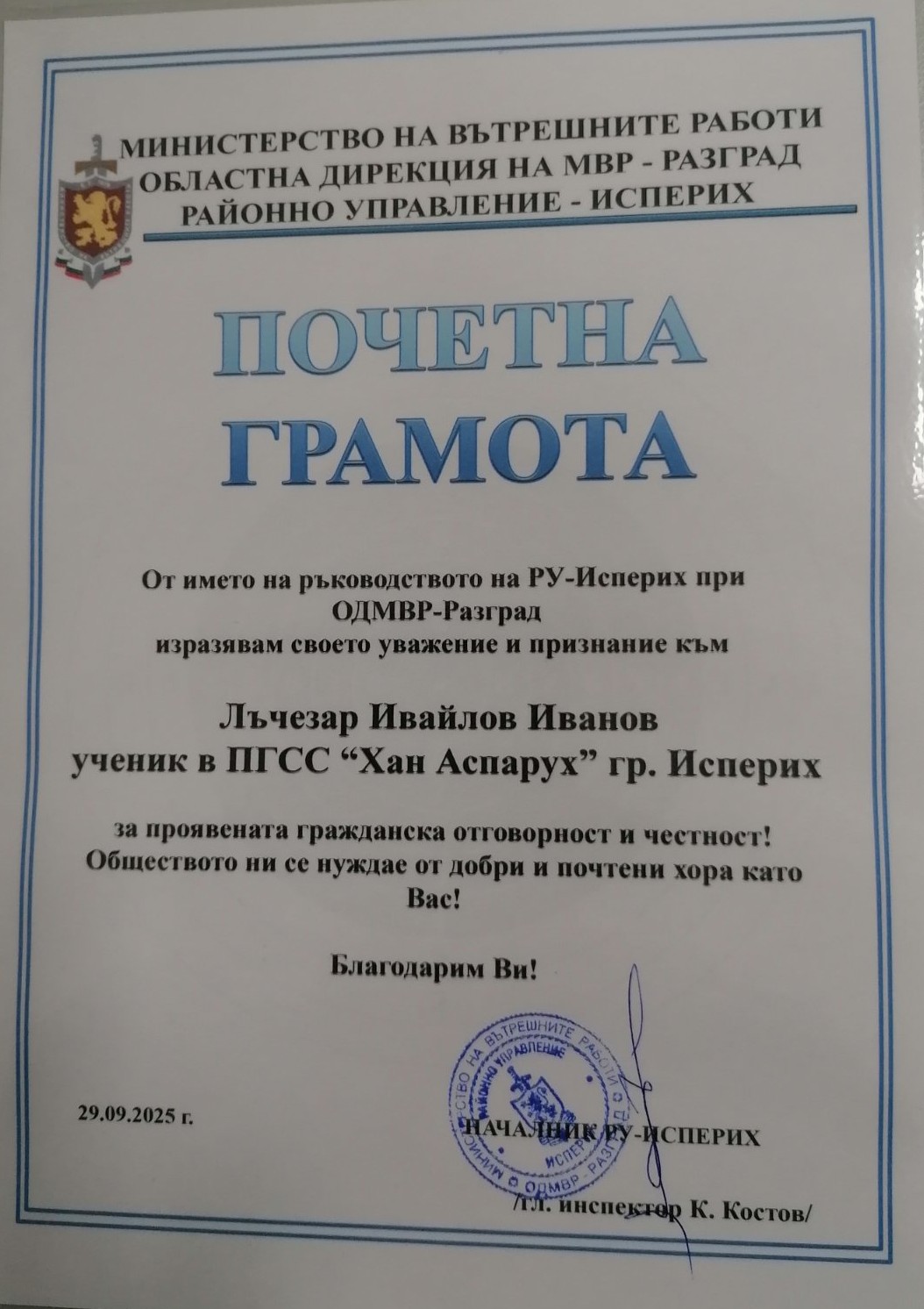 Служителите на РУ – Исперих установили собственика и загубените от него вещи и пари са му предадени с разписка. Началникът на РУ-Исперих главен инспектор Константин Костов благодари за доблестната постъпка на момчетата.