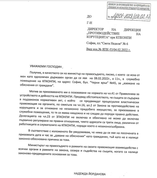 КПКОНПИ публикува писмо на министъра на правосъдието, получено в 16 ч. днес по повод изпратена покана за явяване в дирекция „Противодействие на корупцията“, с цел изясняване на фактите по направените от нея изявления в медиите, съобщиха от антикорупционната комисия.