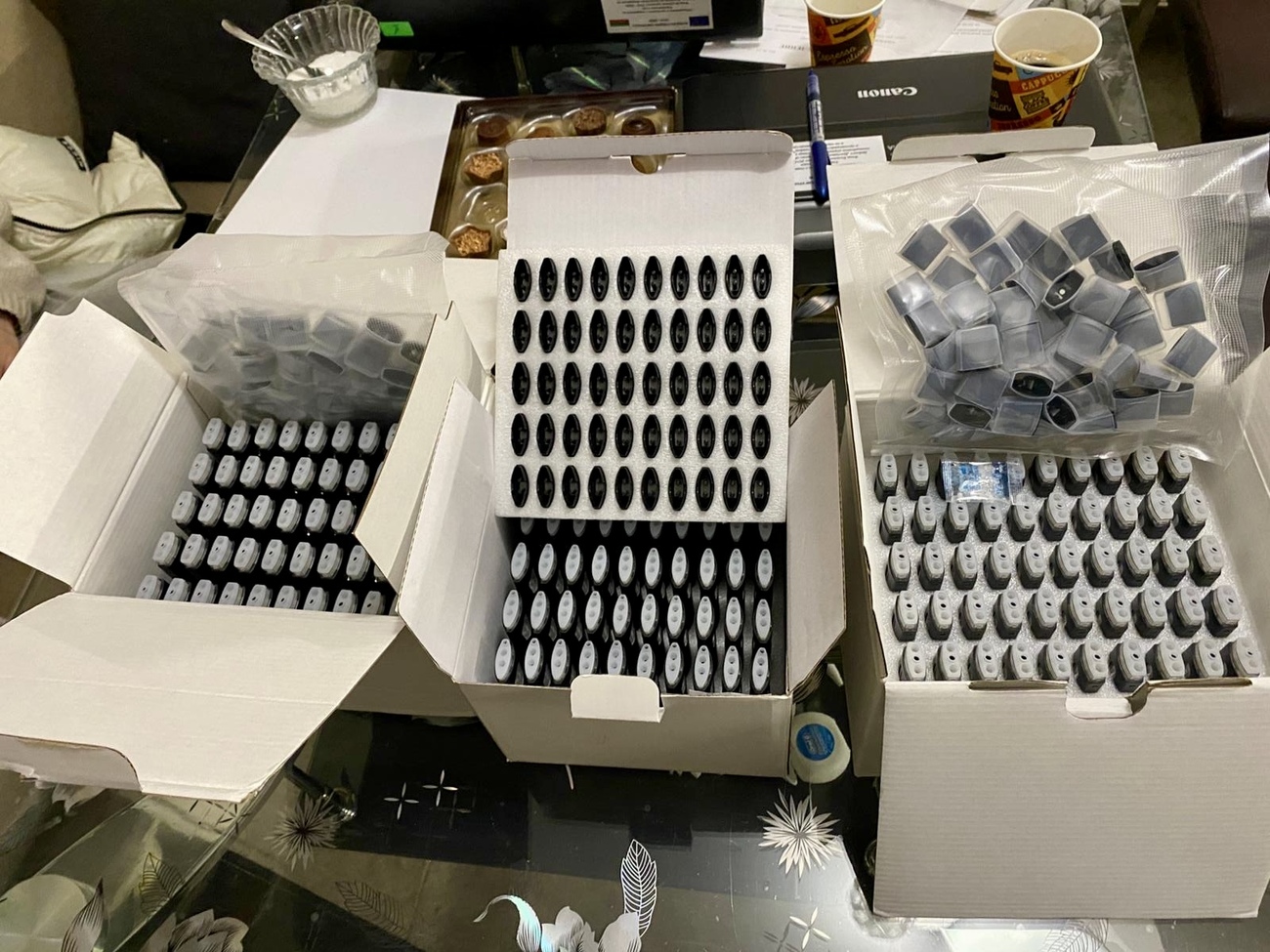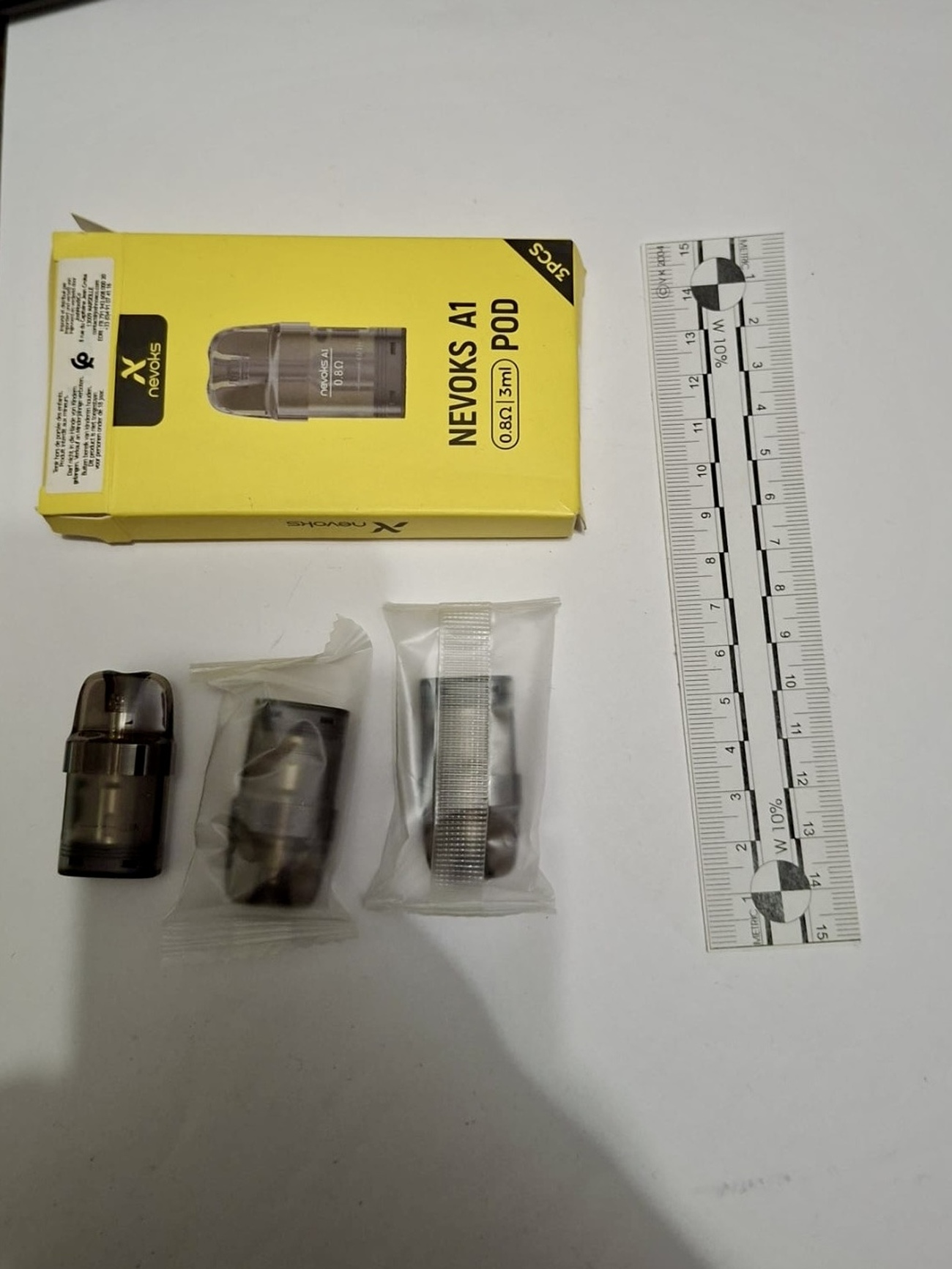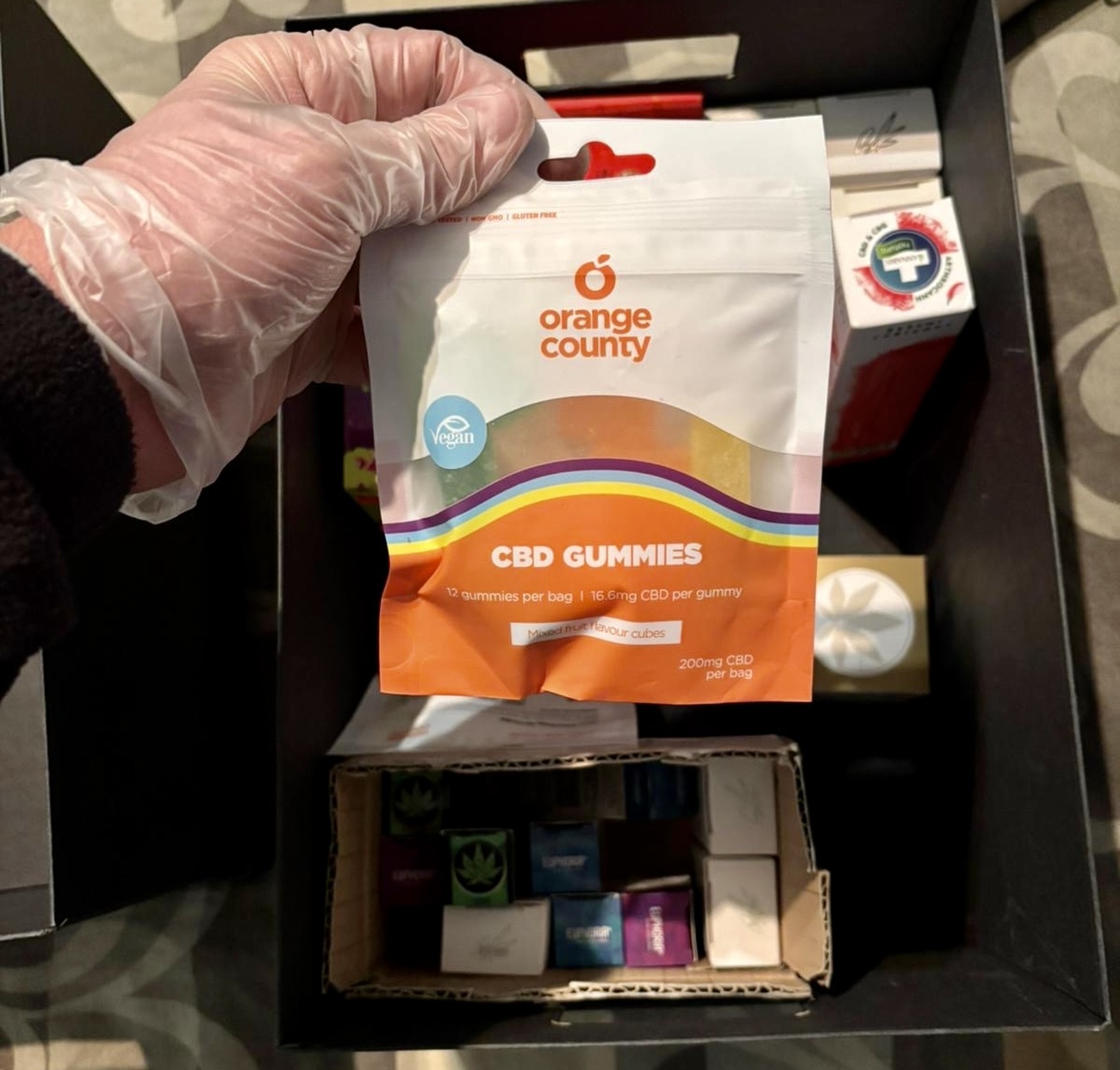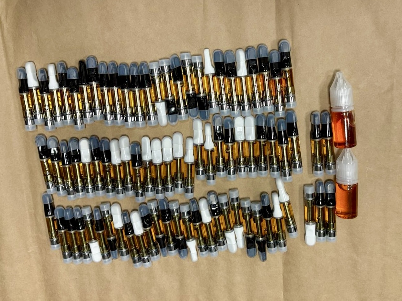 При извършените претърсвания на 14 имота и 2 автомобила са иззети голям брой веществени доказателства: метална бутилка с тегло 1140 грама, съдържаща твърдо смолисто вещество, реагирало на канабиноид, 389 пълнители с вместимост 1 мл с течност, съдържаща канабиноид, 72 електронни цигари (вейп) с течност с канабиноид, две капсули от по 10 мл, съдържащи същата субстанция.