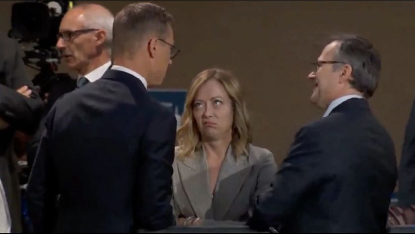 Говорейки с президента на Финландия Александър Стуб, Мелони погледна към тавана и завъртя очи драматично, преди да направи жест към китката си, търсейки въображаем часовник, намеквайки, че планираният час от 10:00 часа минава.