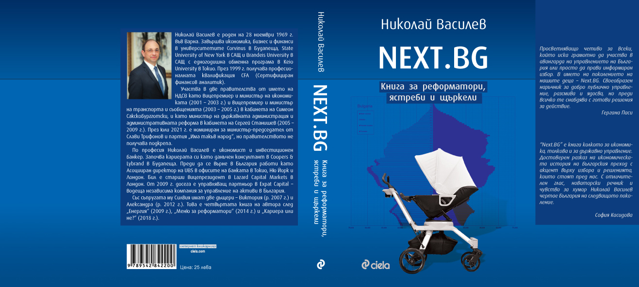 Икономистът Николай Василев ще представи премиерно своята четвърта книга на 27 февруари - “NEXT.BG Книга за реформатори, ястреби и щъркели”. Василев, който е бивш вицепремиер (2001- 2005 г.) и министър на икономиката (2001 - 2003), министър на транспорта и съобщенията (2003 - 2005), както и министър на държавната администрация и административната реформа (2005 - 2009), понастоящем е управляващ партньор в Expat Capital - компания за управление на инвестиционни спестовни сметки. Николай Василев споделя, че книгата е написана в края на 2022 г. и самото начало на 2023 г. след поредните предсрочни парламентарни избори в България и преди следващите.