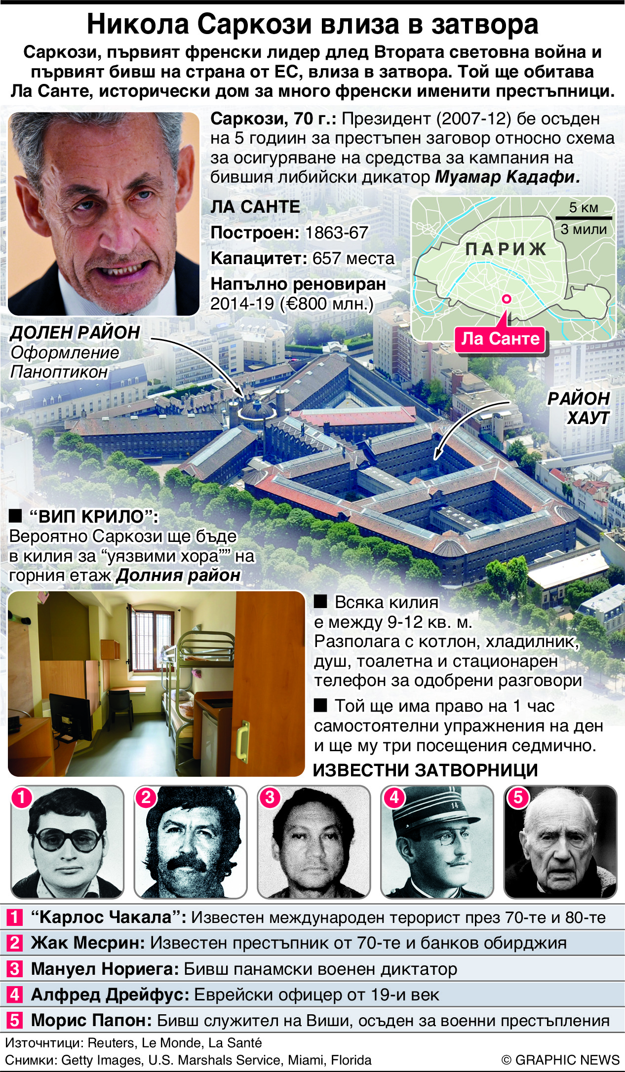 Саркози, първият френски лидер след Втората световна война и първият бивш на страна от ЕС, влиза в затвора. Той ще обитава Ла Санте, исторически дом за много френски именити престъпници.