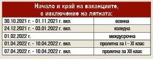 Коледната ваканция за всички ученици ще е от Бъдни вечер (24 декември) 2021 г. до 3 януари 2022 г. Това е записано в проект на заповед за учебното време, също качена за обществено обсъждане. Миналата година учениците почиваха от 22 декeмври или с два дни повече.