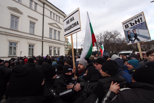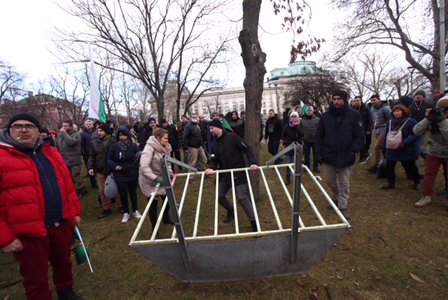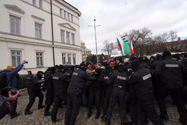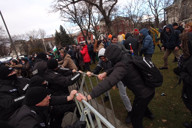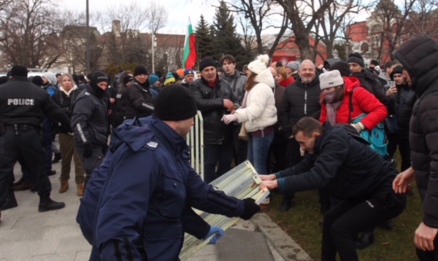 Протестиращите, симпатизанти на партия "Възраждане", дърпат металните заграждения и искат да минат през задния вход на Народното събрание.