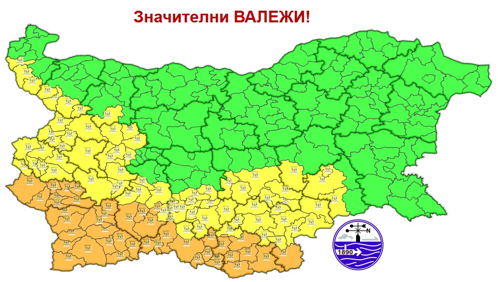Предупреждение от втора степен (оранжев код) е обявено за шест области - ,Кюстендил Благоевград, Пазарджик, Смолян, Кърджали и Хасково. Там може да има значителни валежи от дъжд, в количества 35-65 мм.