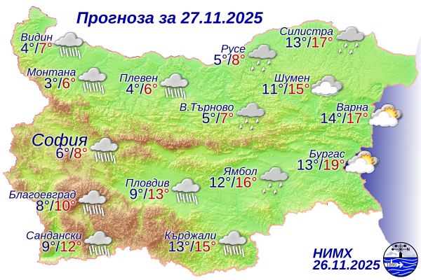 През следващото денонощие ще бъде облачно и дъждовно. Значителни валежи от дъжд ще има през нощта в Западна, а през деня и в Централна Южна България, на места ще има и гръмотевична дейност. Почти без валежи ще е на изток. В Дунавската равнина и Западна България ще нахлува студен въздух, там и температурите ще са почти без дневен ход - между 3° и 7°. В останалата част от страната вятърът ще остане умерен и поривист и минималните температури ще са между 7° и 12°, а максималните ще са между 12° и 17°. В София минималната температура ще е около 6, максимална – около 8°.