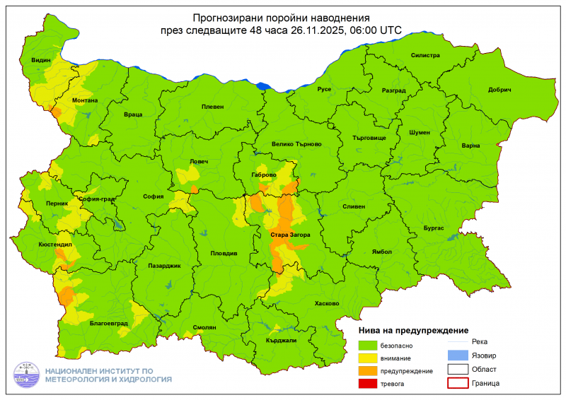 През следващите 48 часа в части от областите Стара Загора, Видин, Монтана, Кюстендил и Благоевград има опасност от възникване на поройни наводнения, предупреждават от НИМХ.