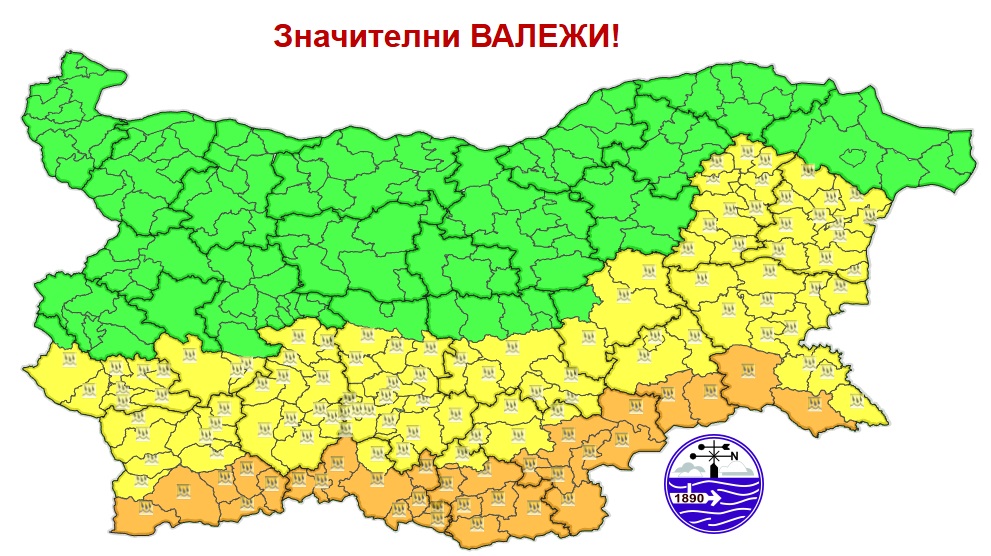 Жълт Очаква се количеството на валежите да достигне 35-65 мм за 24 часа, но са възможни и интензивни извалявания - над 30 мм за 6 часа.