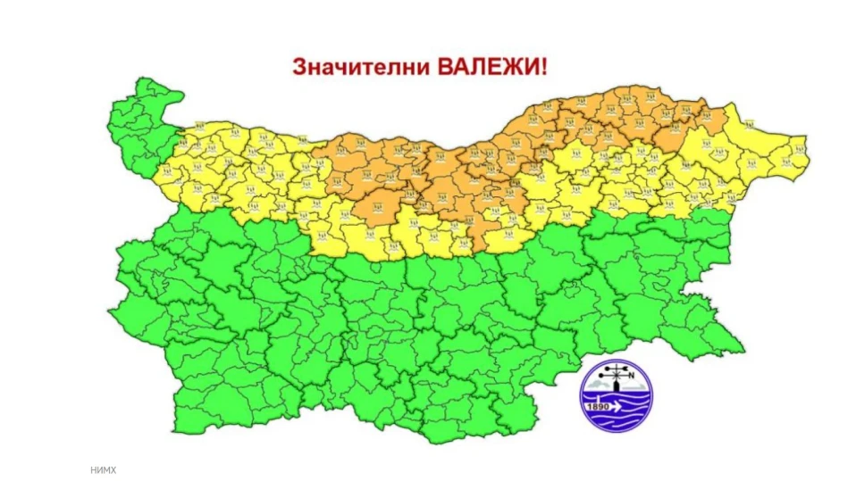 Оранжев предупредителен код за опасно време е обявен за: Плевен, част от Ловеч, Велико Търново, Русе, Силистра, част от Добрич и Разград. Жълт код за потенциално опасно време е в сила за: Монтана, Враца, част от Ловеч, Габрово, Търговище, част от Разград, Шумен, Варна и част от Добрич.