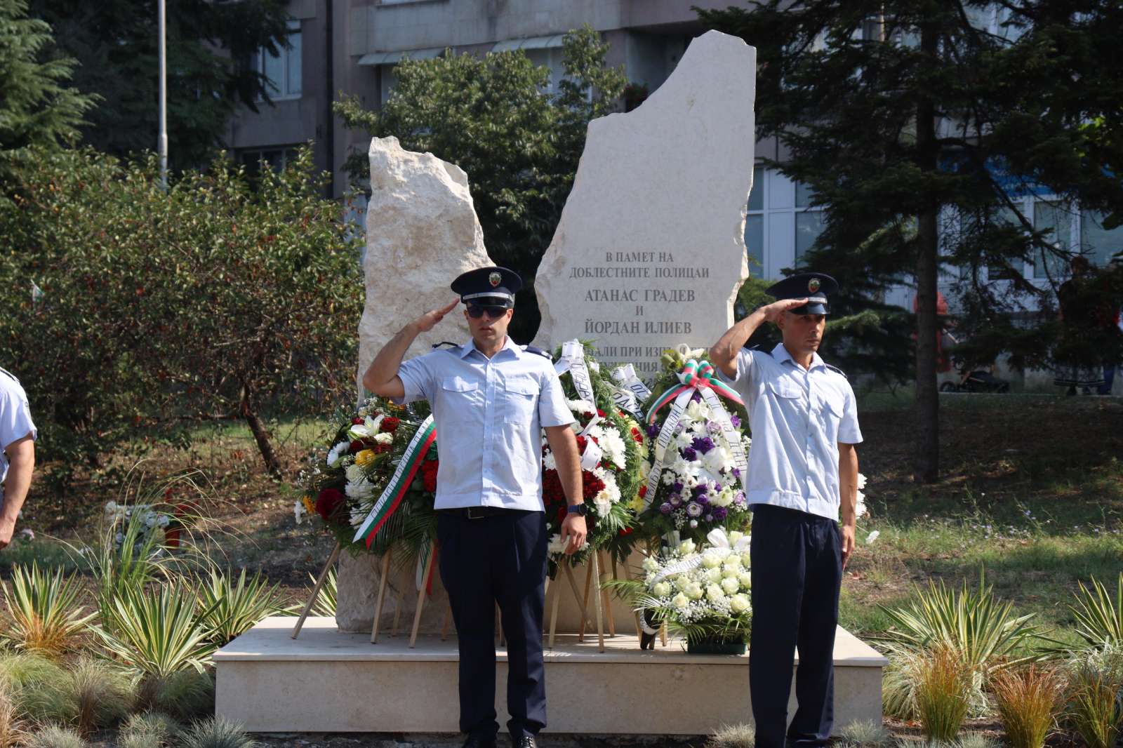 В Бургас откриха паметника на трагично загиналите млади полицаи, които с патрулката си опитаха да спрат автобус с мигранти на входа на града. Инцидентът стана точно преди година. Старши инспекторите от Първо РУ Атанас Градев (43 г.) и Йордан Илиев (30 г.) загубиха живота си рано сутринта на 25 август 2022 г., след като бяха пометени заедно с патрулната кола при входа на кръговото кръстовище „Трапезица” от движещ се с бясна скорост автобус, пълен с мигранти.