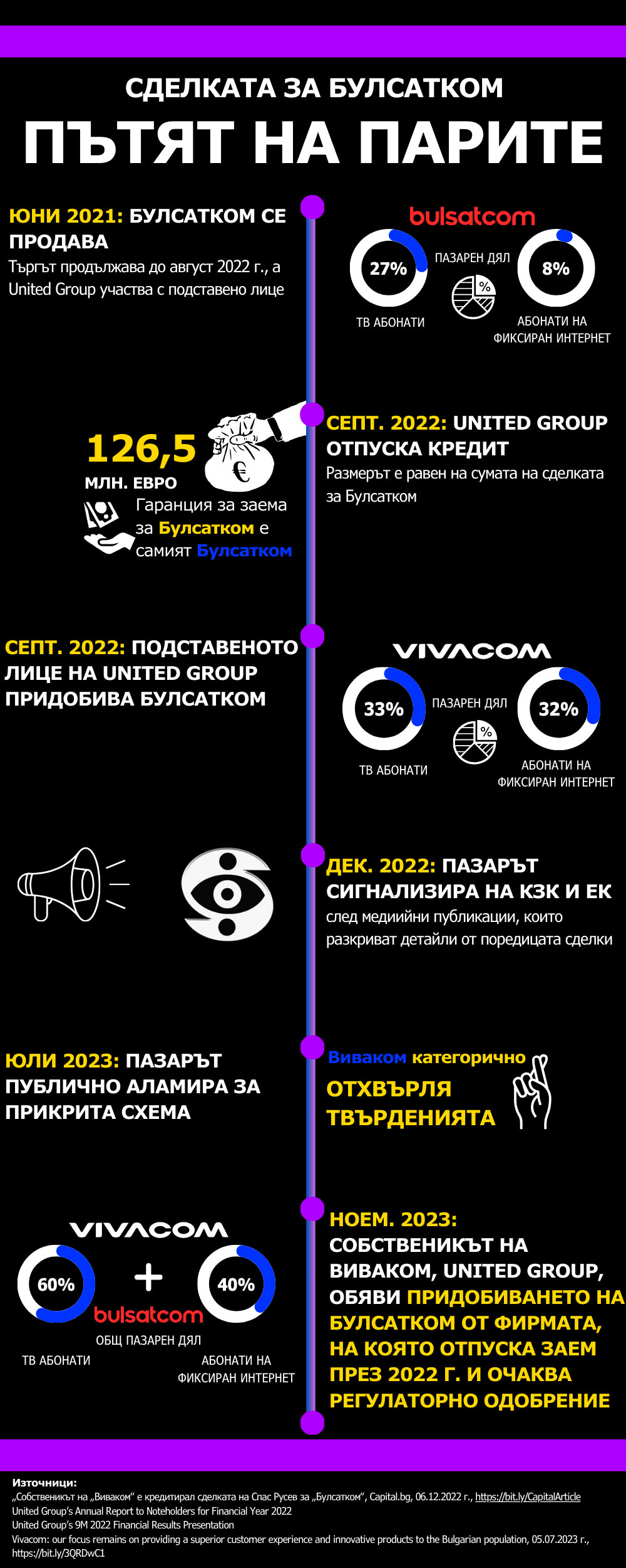 Обявеното на 9.11.2023 г. намерение от собственика на United Group за придобиване на Булсатком официално потвърждава схемата, за която А1 и други пазарни играчи сигнализираха още в края на миналата година. Тогава предупредихме публично, че Виваком ще се опита да погълне Булсатком от настоящия му собственик, който го е купил със заем от United Group.