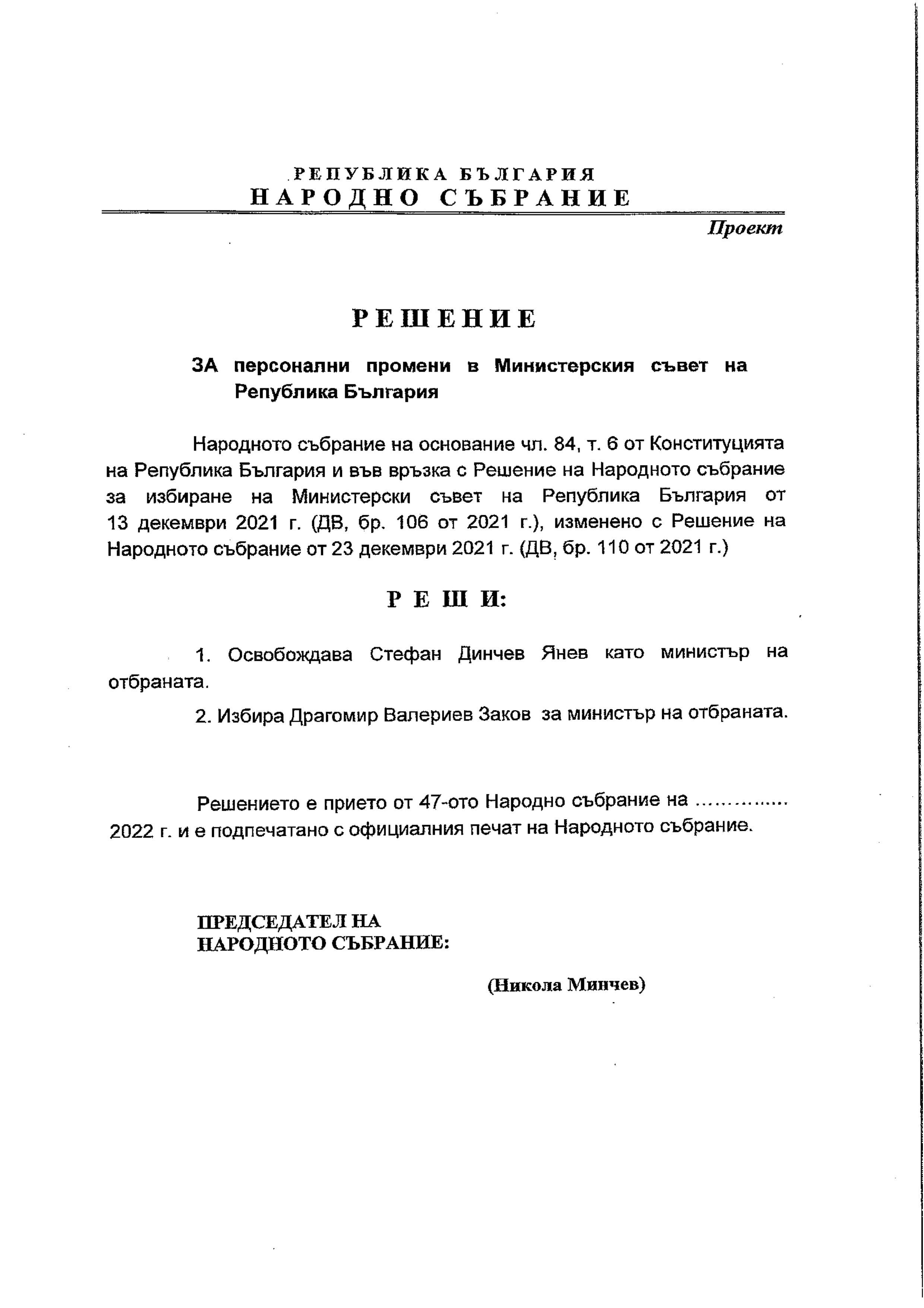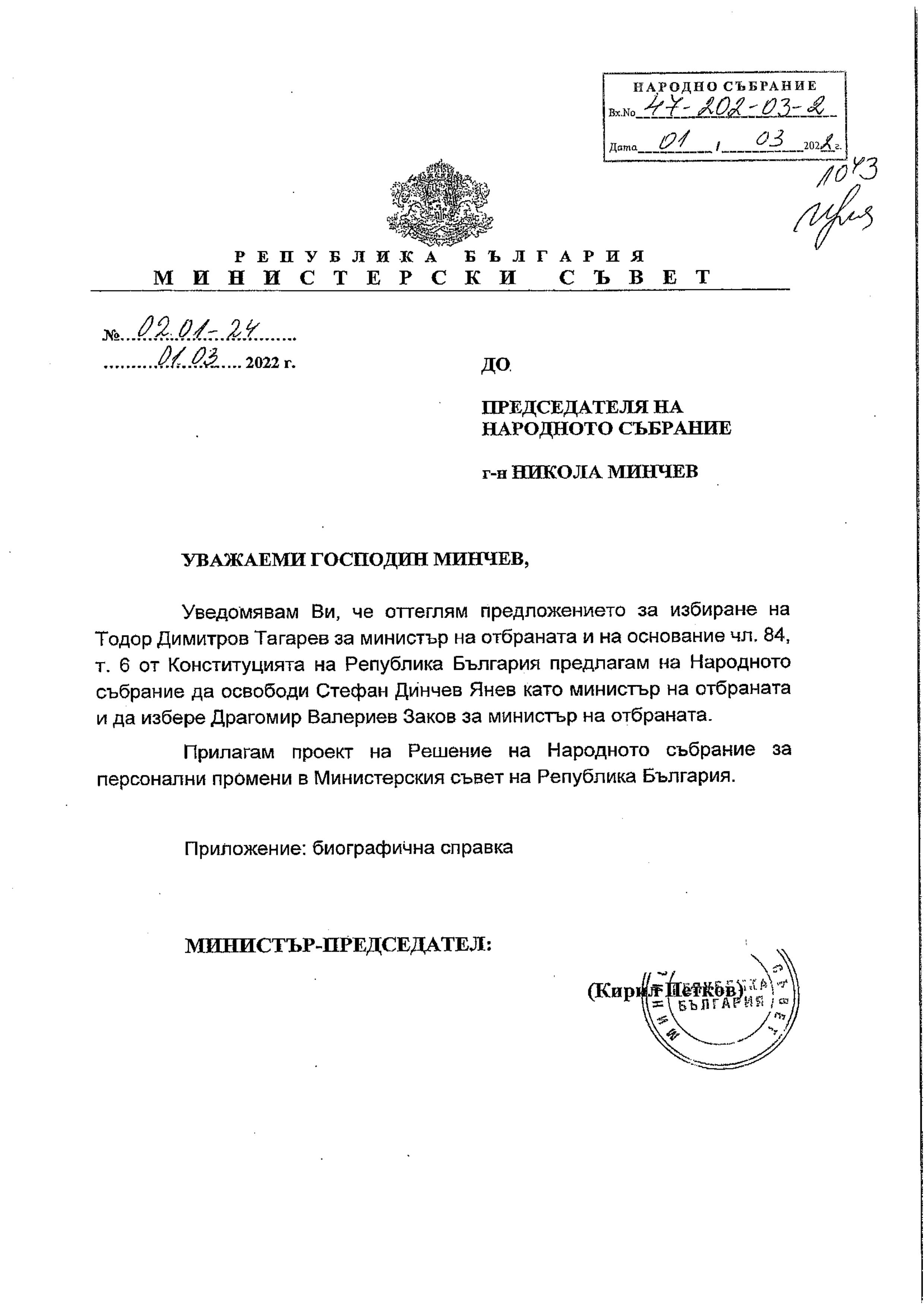 "Уведомявам Ви, че оттеглям предложението за избиране на Тодор Димитров Тагарев за министър на отбраната и на основание чл. 84, т. 6 от Конституцията на Република България предлагам на Народното събрание да освободи Стефан Динчев Янев като министър на отбраната и да избере Драгомир Валериев Заков за министър на отбраната. Прилагам проект на Решение на Народното събрание за персонални промени в Министерския съвет на Република България."