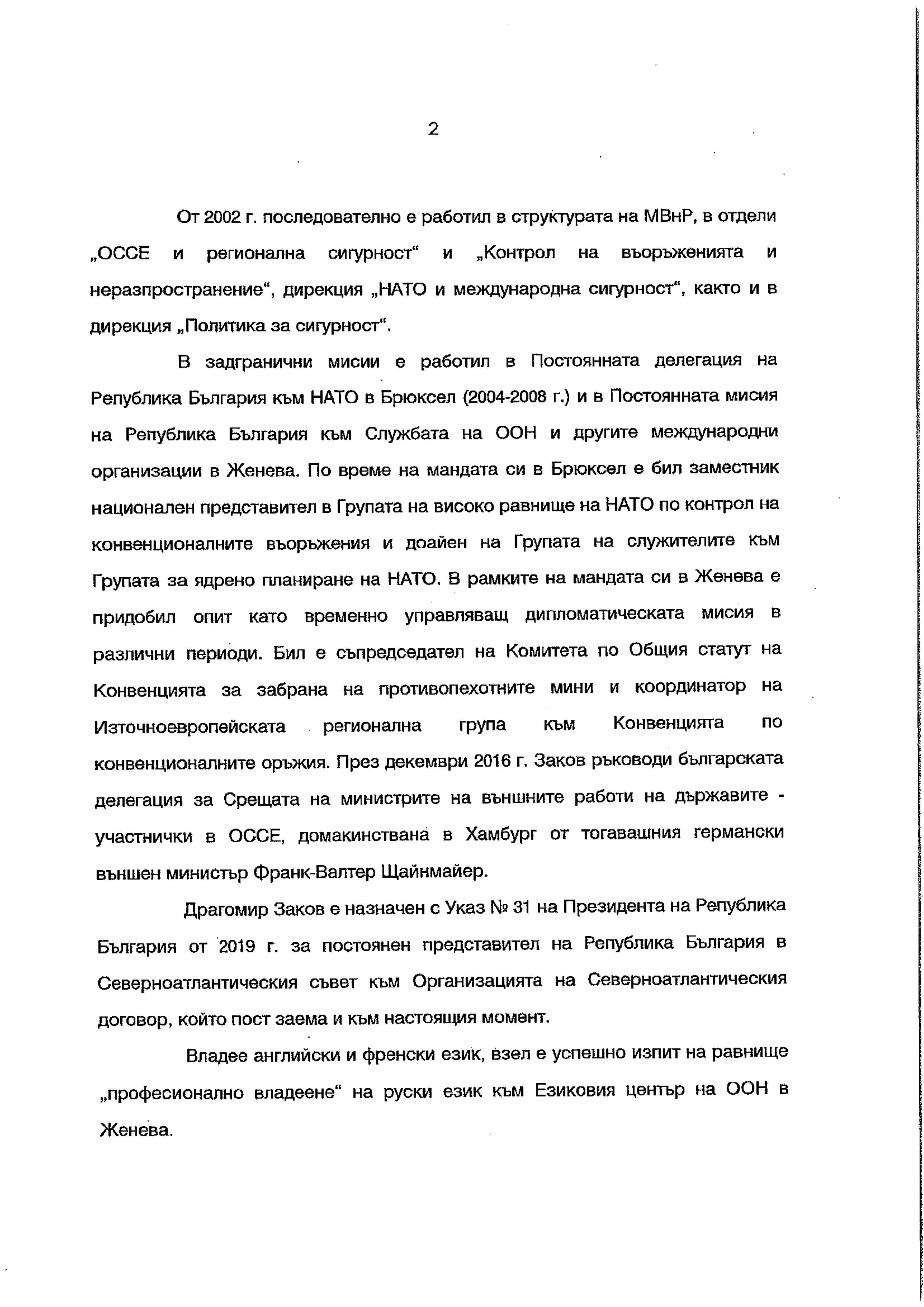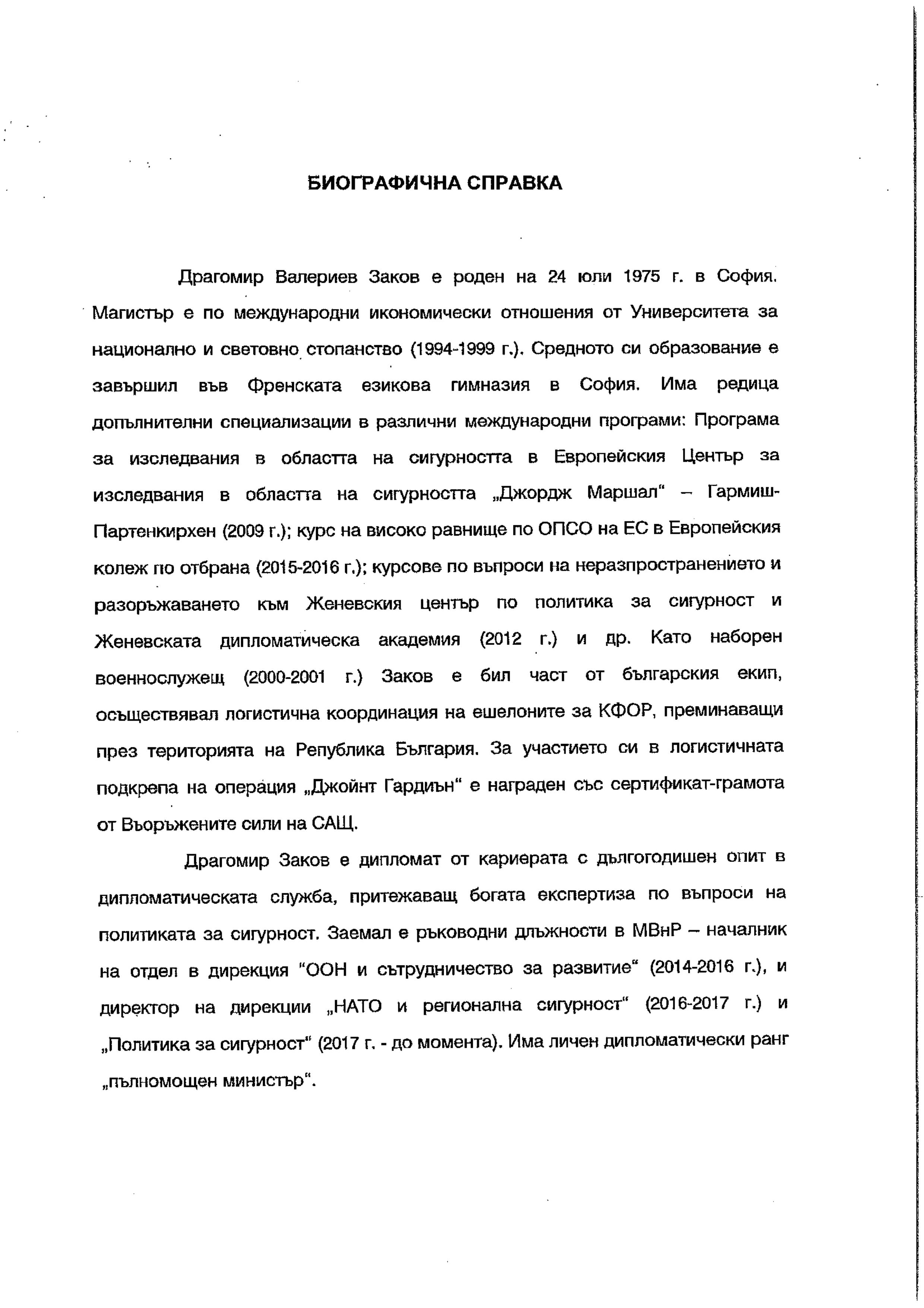 Документ с този текст беше публикуван на интернет страницата на Народното събрание заедно с биография на Драгомир Заков.