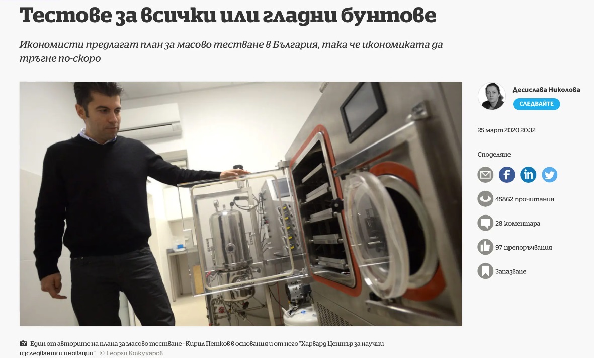 Броени дни след въвеждането на извънредното положение у нас през март 2021 г. заради разпространението на коронавируса Петков, Василев и Денков обикаляха телевизиите като в ефир си правеха бързи антигенни тестове. Тримата настояваха държавата да поеме еднократното тестуване на цялото население, което трябваше да се осъществи за няколко седмици. Тримата обясняваха, че, за да не се „затваря“ икономиката, тогавашното правителство да плати спешно тестовете на над 6 млн. българи, което трябваше да бъде извършено от частни лаборатории. Статии в подкрепа на „иновативната“ идея на тримата се появиха и в изданията на Иво Прокопиев като една от тях беше на самия издател на „Капитал“.