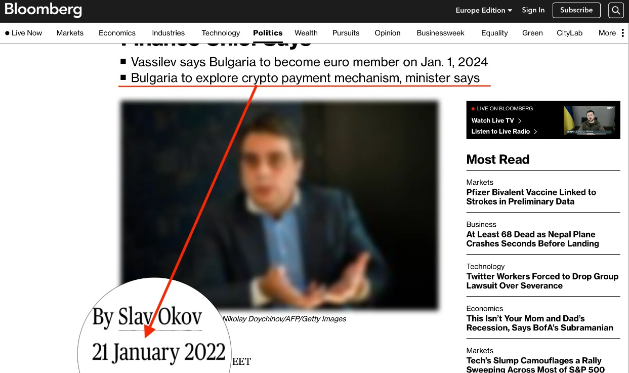 Пред кореспондента за България на Bloomberg – журналистът Слав Оков, бивш финансов репортер в издания на Иво Прокопиев, Асен Василев излага своите приоритети като министър на финансите – въвеждане на еврото от 1 януари 2024 г. и проучване на възможността за въвеждане на крипторазплащания през българската банкова система.