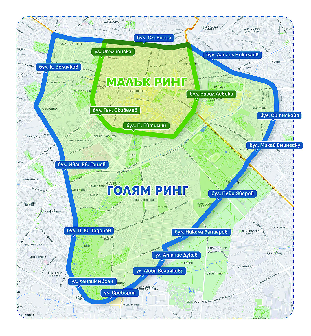Забраната в “Големия ринг” се отнася само до автомобилите от нулева и I екогрупа - двутактови и бензинови двигатели с Евро I и Евро II, произведени до 1996 г. и с дизелови двигатели с Евро I, Евро II и Евро III, произведени до 2002 г. По-голямата зона е между булевардите “Сливница”, “Данаил Николаев”, “Ситняково”, “Михай Еминеску”, “П. Яворов”, “Никола Й. Вапцаров”, “Х. Ибсен”,“П. Ю. Тодоров”, “И. Е. Гешов” и бул. “К. Величков”. Входовете към зоните “Голям и Малък ринг” трябва да бъдат означени с пътни знаци.