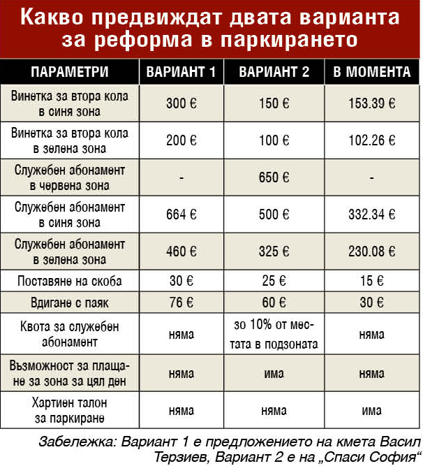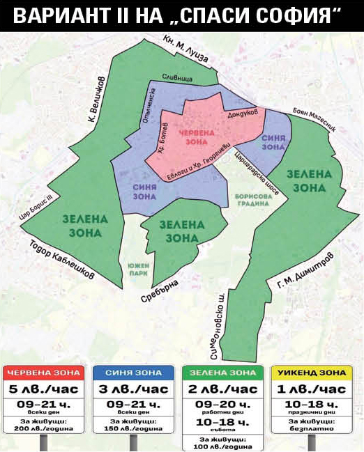 Вариантът на “Спаси София” предвижда центърът на столицата да бъде обхванат от червена зона, в която да се плаща по 5 лева за час престой. Синята зона ще заеме части от сегашната зелена и е предложено да струва 4 лева на час. За зелената е предвидено да се разпростре в нови квартали и паркирането да е да 2 лева на час.