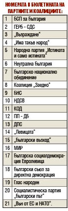Успех, водещ към победа на предсрочните парламентарни избори на 2 април, така част от политическите партии и коалиции коментираха номерата в бюлетината, които им се паднаха след жребия в ЦИК днес. Във вота след два месеца ще участват 14 партии и 7 коалиции (виж таблицата).