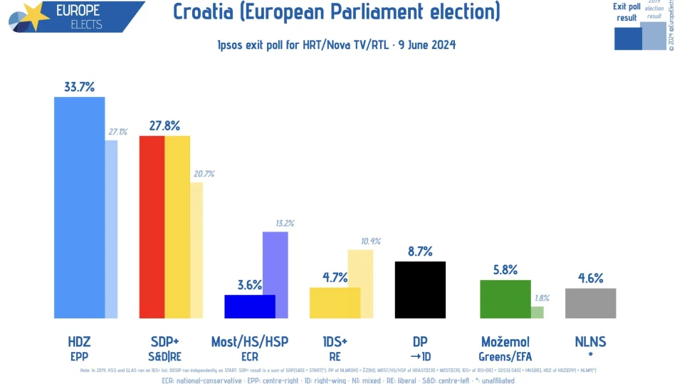 Дойдоха и първите прогнози от Хърватия. Дясноцентристката партия на премиера Андрей Пленкович си е осигурила 33,74% от гласовете. Това би означавало шестима евродепутати, според екзитпол, публикуван от информационната агенция на страната HINA. Това би дало на Хърватския демократичен съюз (ХДС) допълнителни двама депутати спрямо четирима днес.