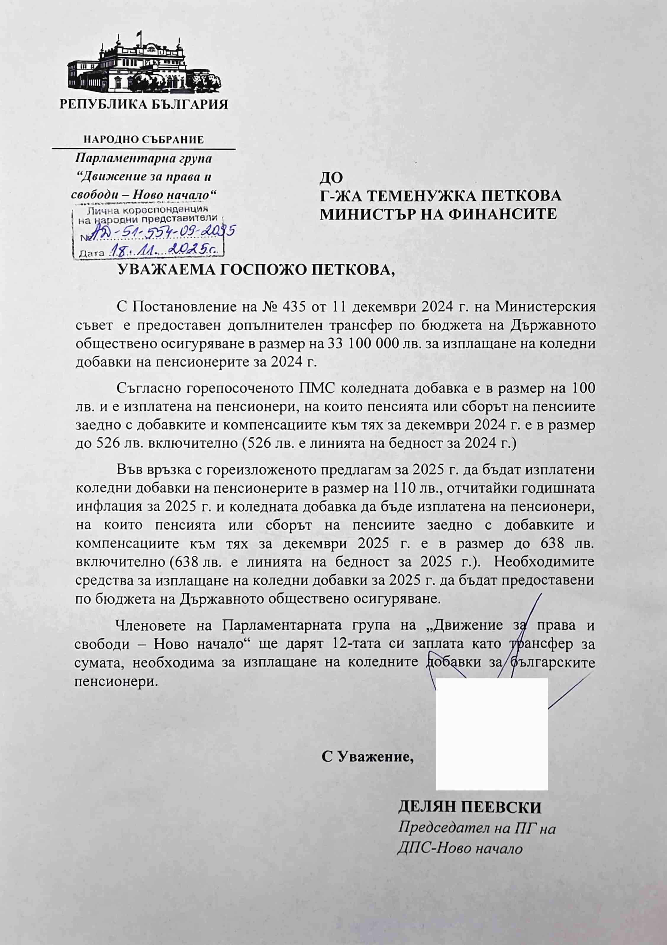 Лидерът на ДПС и ПГ на ДПС-Ново начало Делян Пеевски поиска от финансовия министър Теменужка Петкова правителството да осигури с постановление изплащането на коледни надбавки за пенсионерите, в размер на 110 лв (със 10 лева повече, спрямо 2024-та година). Това съобщиха от пресцентъра на ДПС-Ново начало.