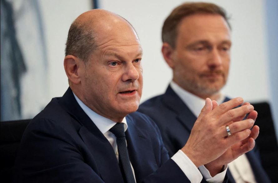 Канцлерът Олаф Шолц и финансовият министър Кристиан Линднер на представянето днес на новите мерки в подкрепа на гражданите и бизнеса заради инфлацията и скъпата енергия.