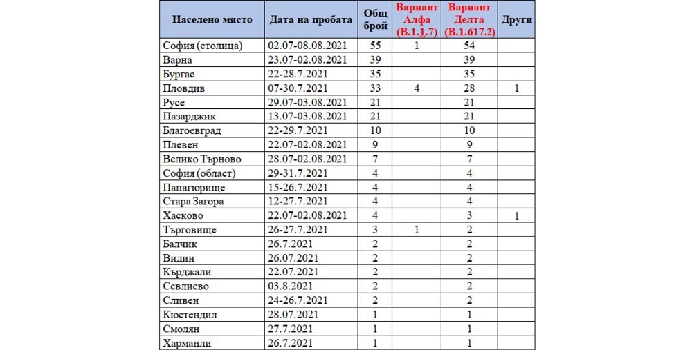 Клиничните проби са били взети от пациенти с COVID-19 в периода 2 юли - 8 август 2021 г. и са били изпратени от 49 различни лечебни заведения от 21 области на страната. Най-много проби с "Делта" вариант са били установени в София, Варна, Бургас, Пловдив, Русе, Пазарджик и Благоевград.