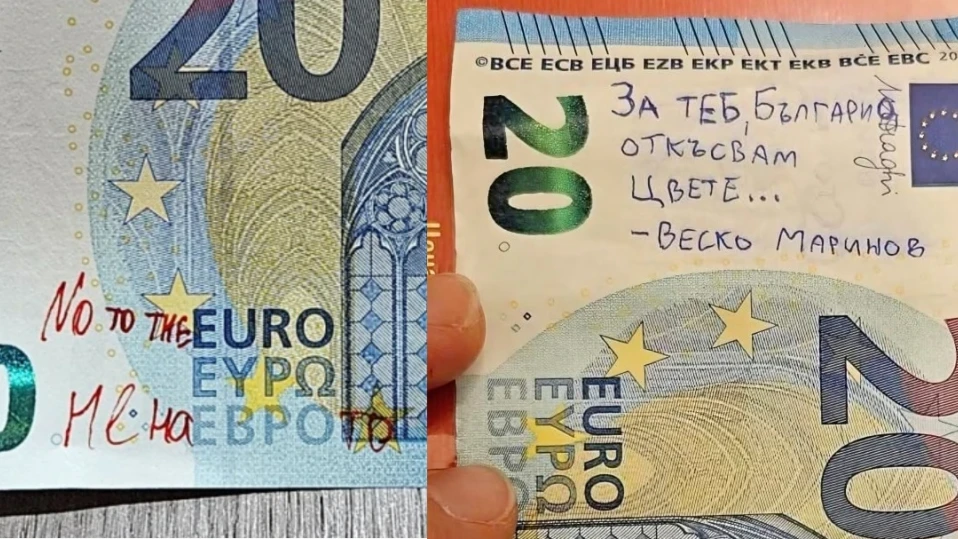 Въпросът с надрасканите банкноти евро възникна заради мания, която стартира от Бургас. Майтапчийската кауза е наречена „Операция Веселин Маринов“ и развихри творческия подем на зевзеците. Идеята е върху всяко евро, което попадне в български джоб, да се напише цитат от песен на Веселин Маринов. Някои бургазлии призовават „Да залеем цяла Европа с откъси от песни на Веско!“. В социалните мрежи разпространяват снимки на банкнота от 10 евро с надпис „За теб живея“, петачка с „Лятна жълта рокля“ и двайсетачка с „За теб България откъсвам цвете“. Зевзек коментира, че надписите не трябва да бъдат на кирилица, а на английски, защото „иначе французите ще решават, че е проклятие“. Не е ясно колко банкноти са надписани по този начин, но това се превръща в тренд в социалните мрежи.