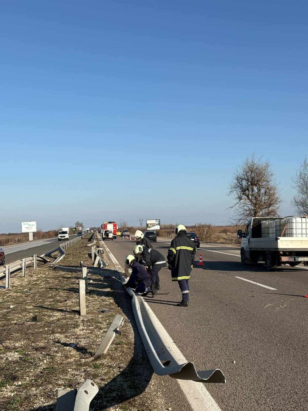 В момента екип на РСПБЗН-Пазарджик изрязва и отстранява скъсаната мантинела от зоната на платното и обезопасява лентите за движение.