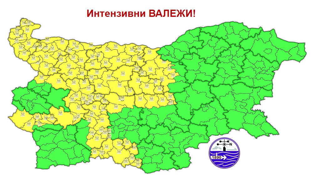 Националният институт по метеорология и хидрология (НИМХ) издаде предупреждение от първа степен - жълт код, за интензивни по количества валежи от дъжд в по-голямата част от Западна България за утре, четвъртък, 23 май.