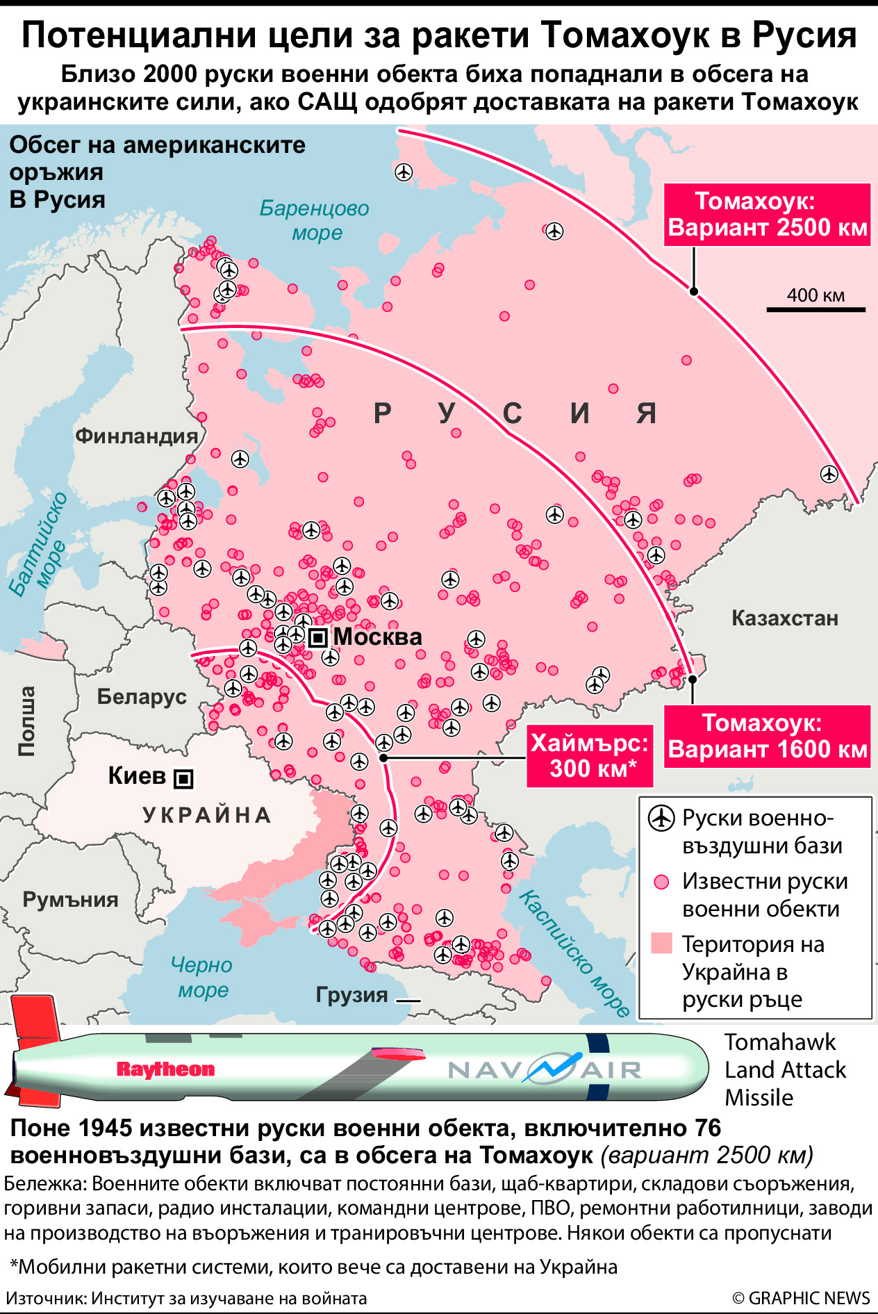 Близо 2000 руски военни обекта биха попаднали в обсега на украинските сили, ако САЩ одобрят доставката на ракети "Томахоук".