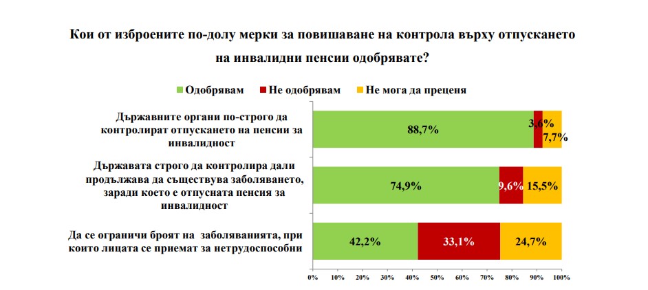 Висок е делът (89%) на пълнолетните български граждани, според които държавните органи трябва по-строго да контролират отпускането на пенсиите за инвалидност.