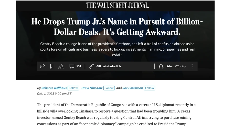 Частта в нея, посветена на посещението у нас на Тръмп-младши и срещата му с Бойко Борисов, е около една двадесета от целия текст. Тя просто е в абсолютен синхрон с останалото написано от авторите Ребека Болхаус, Дрю Хиншоу и Джо Паркинсън, а именно дейността на тексаския инвеститор Гентри Бийч - дългогодишен приятел на Доналд Тръмп младши, който обикаля света, представяйки се като част от нова „икономическа дипломация“ на администрацията на Тръмп. Бийч е водил разговори с правителства в Африка, Близкия изток и Азия, предлагайки инвестиции за милиарди долари и често създавайки объркване дали говори от името на американското правителство.