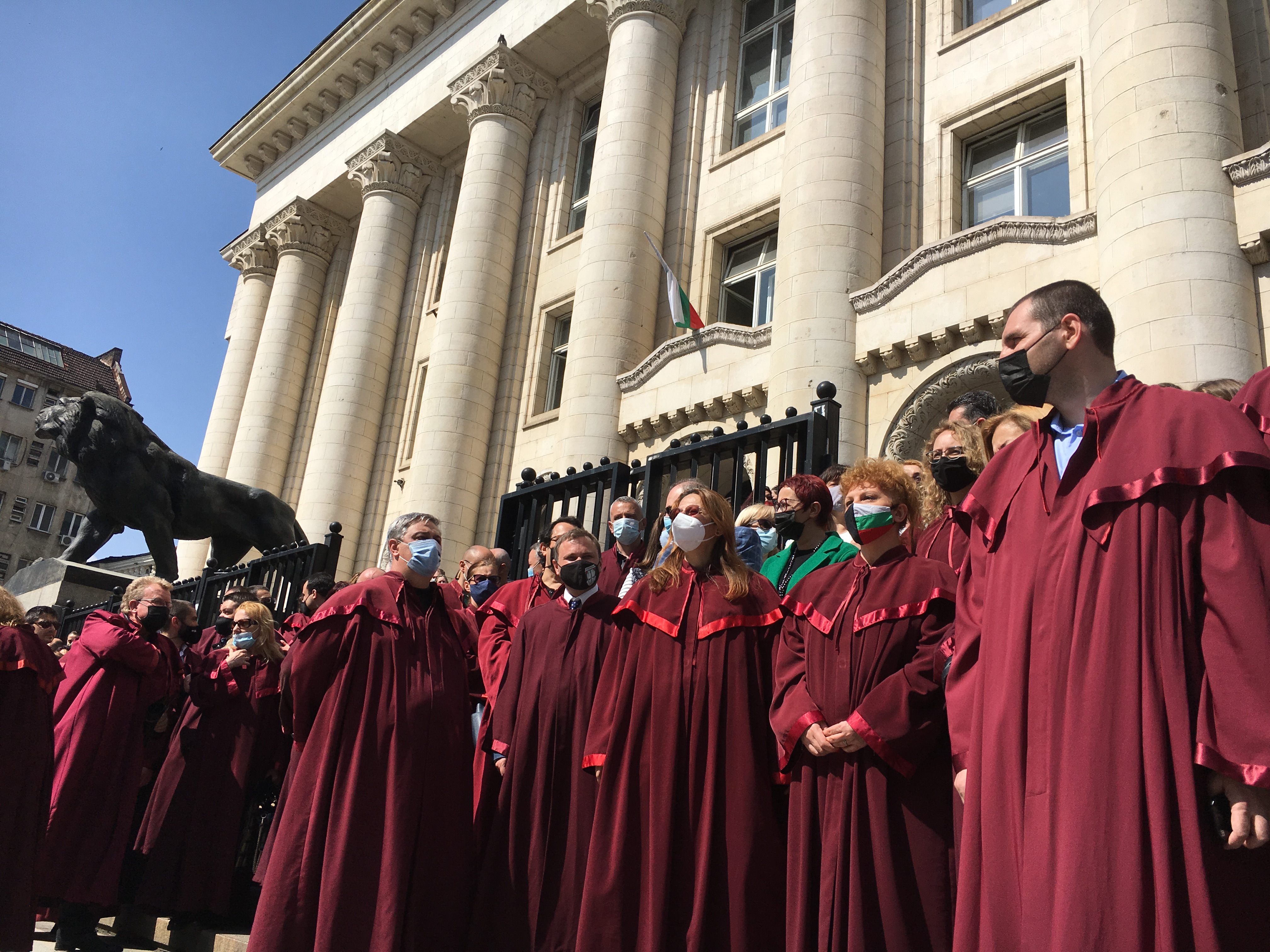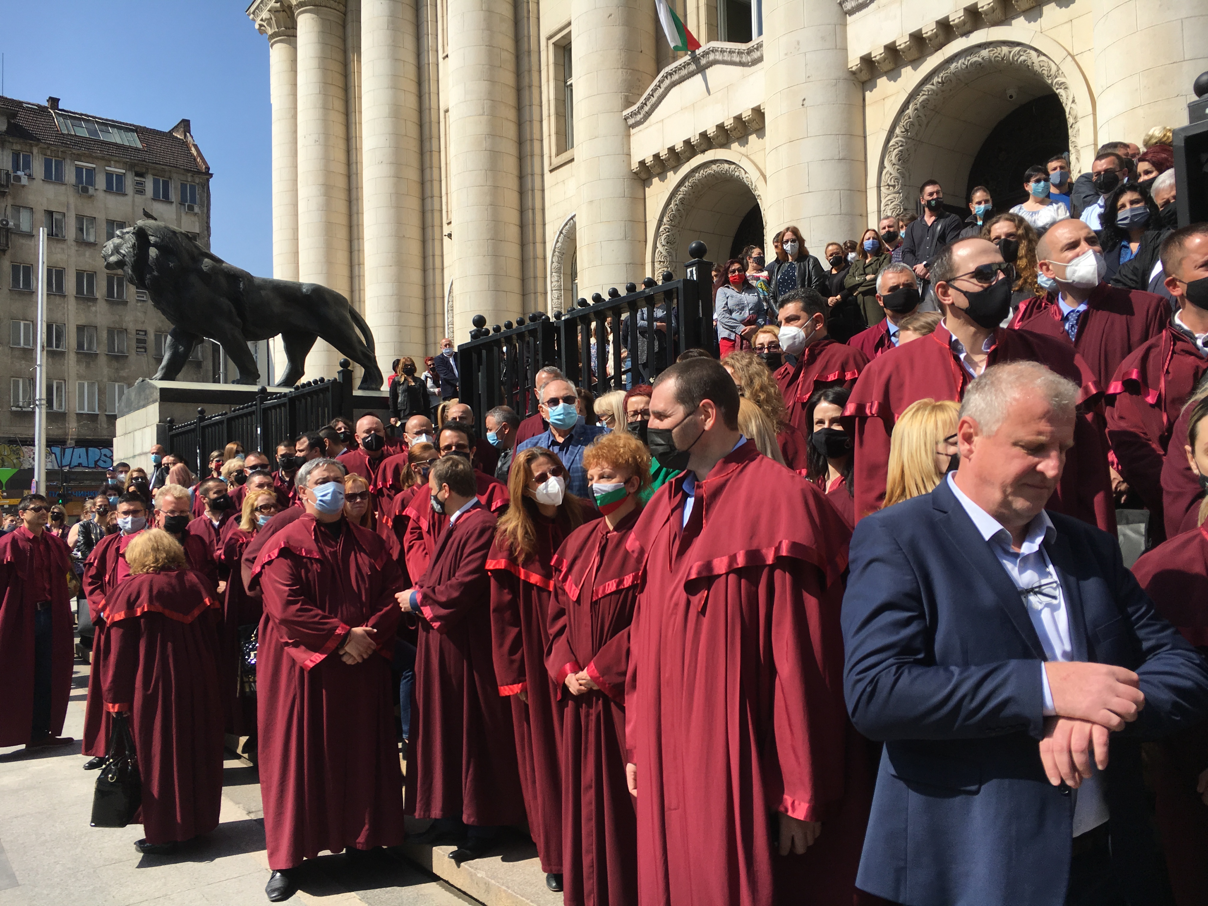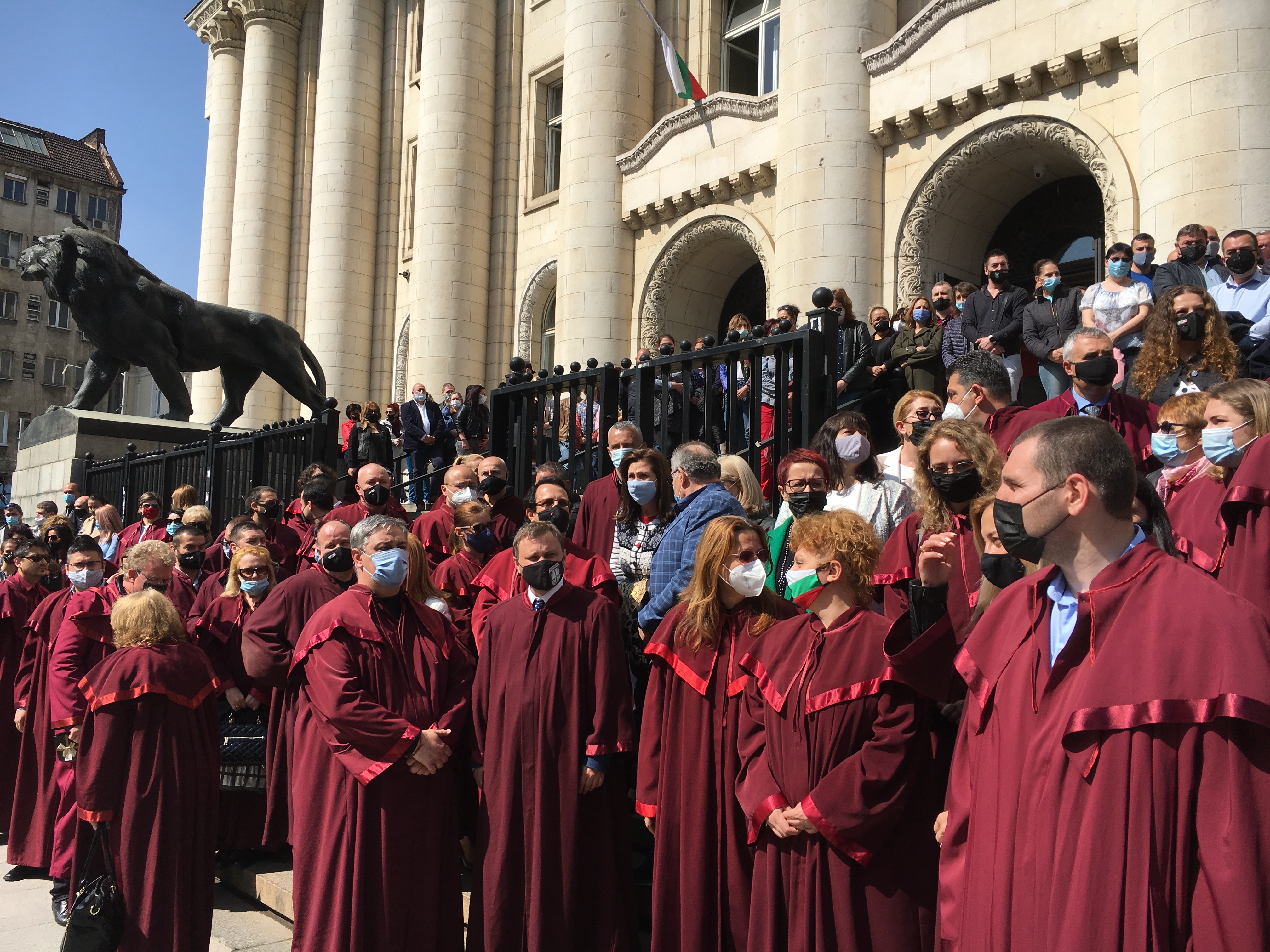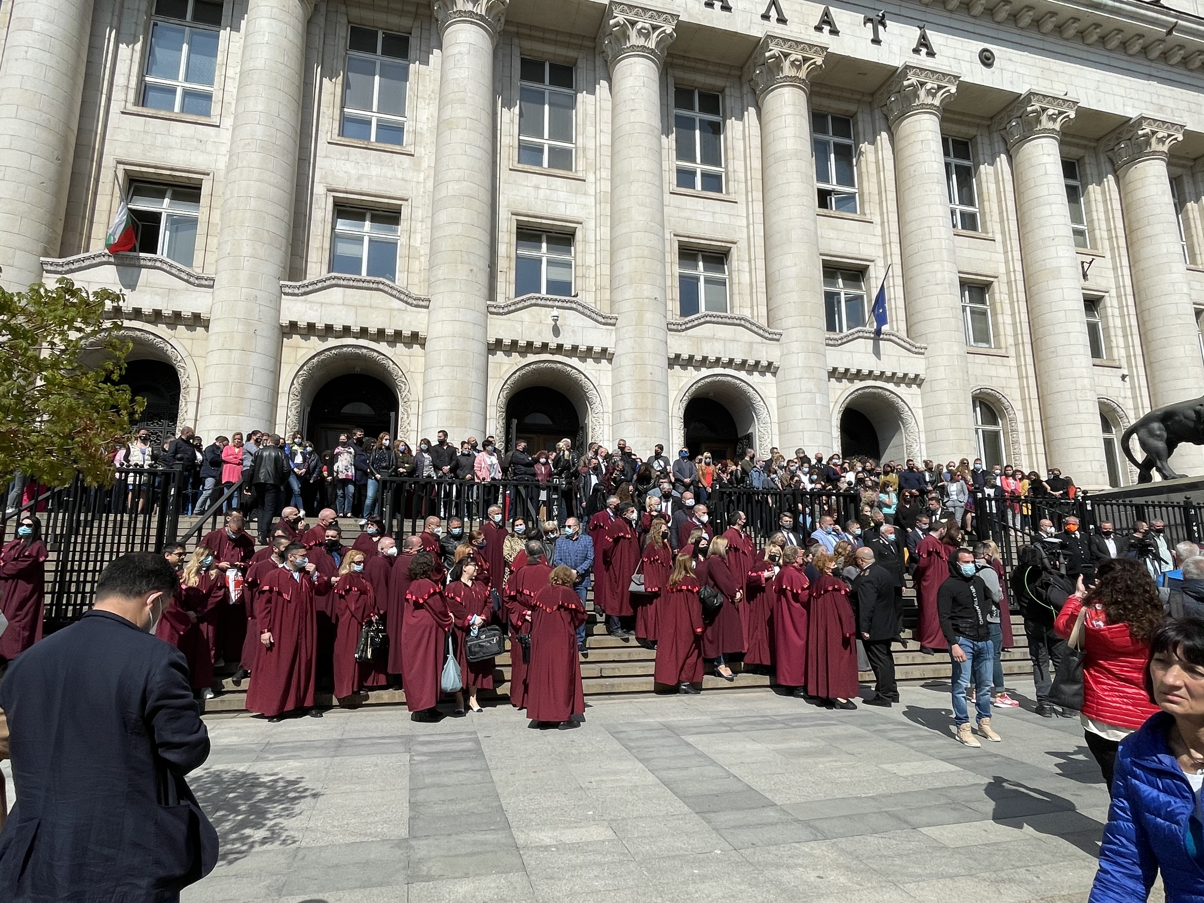 Прокурори, следователи и служители в прокуратурите във Велико Търново, Варна, Добрич, Силистра, Разград, Шумен, Плевен, Габрово, Благоевград и в Софийския апелативен район излязоха на мълчалив протест пред сградите на Съдебните палати в цялата страна.