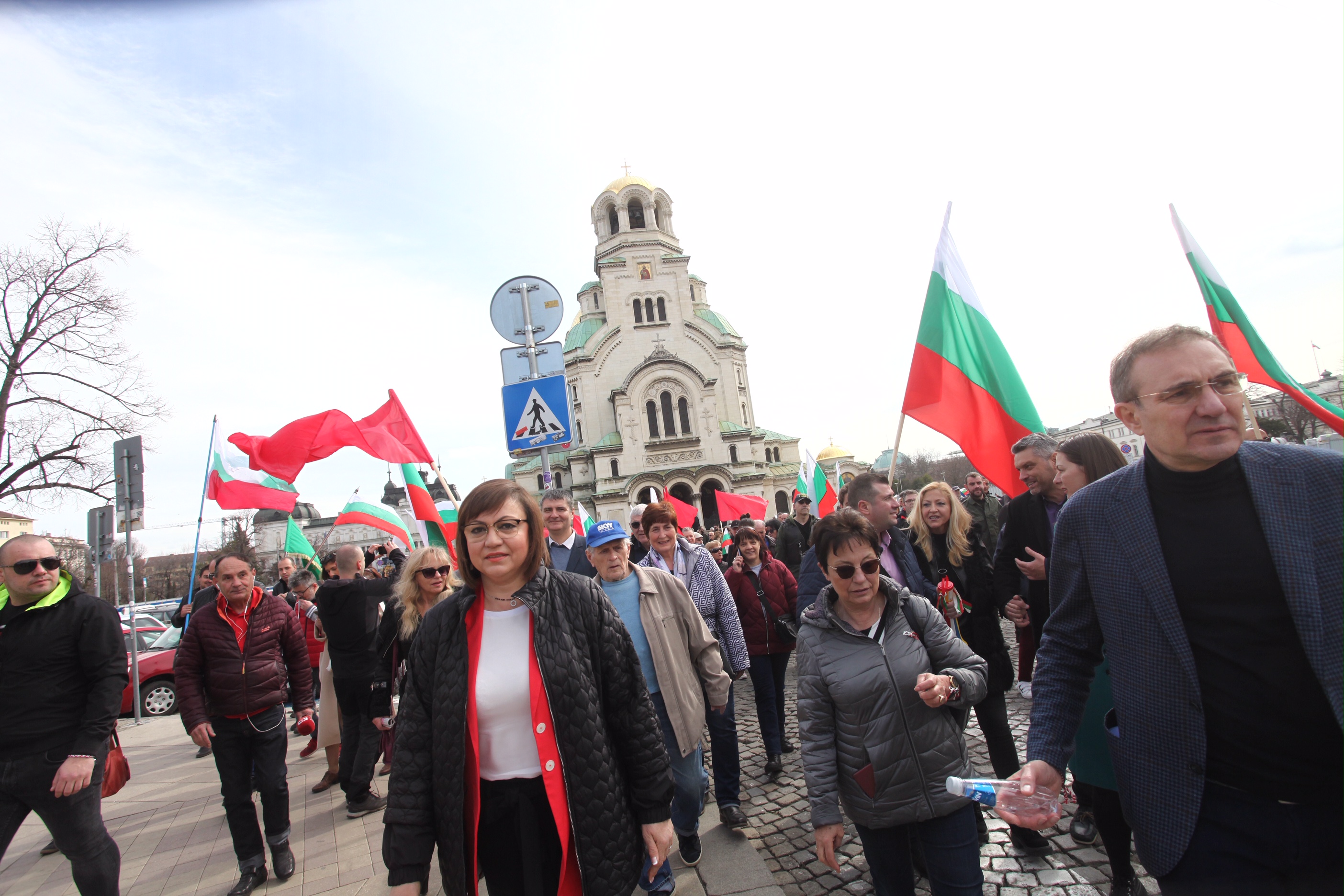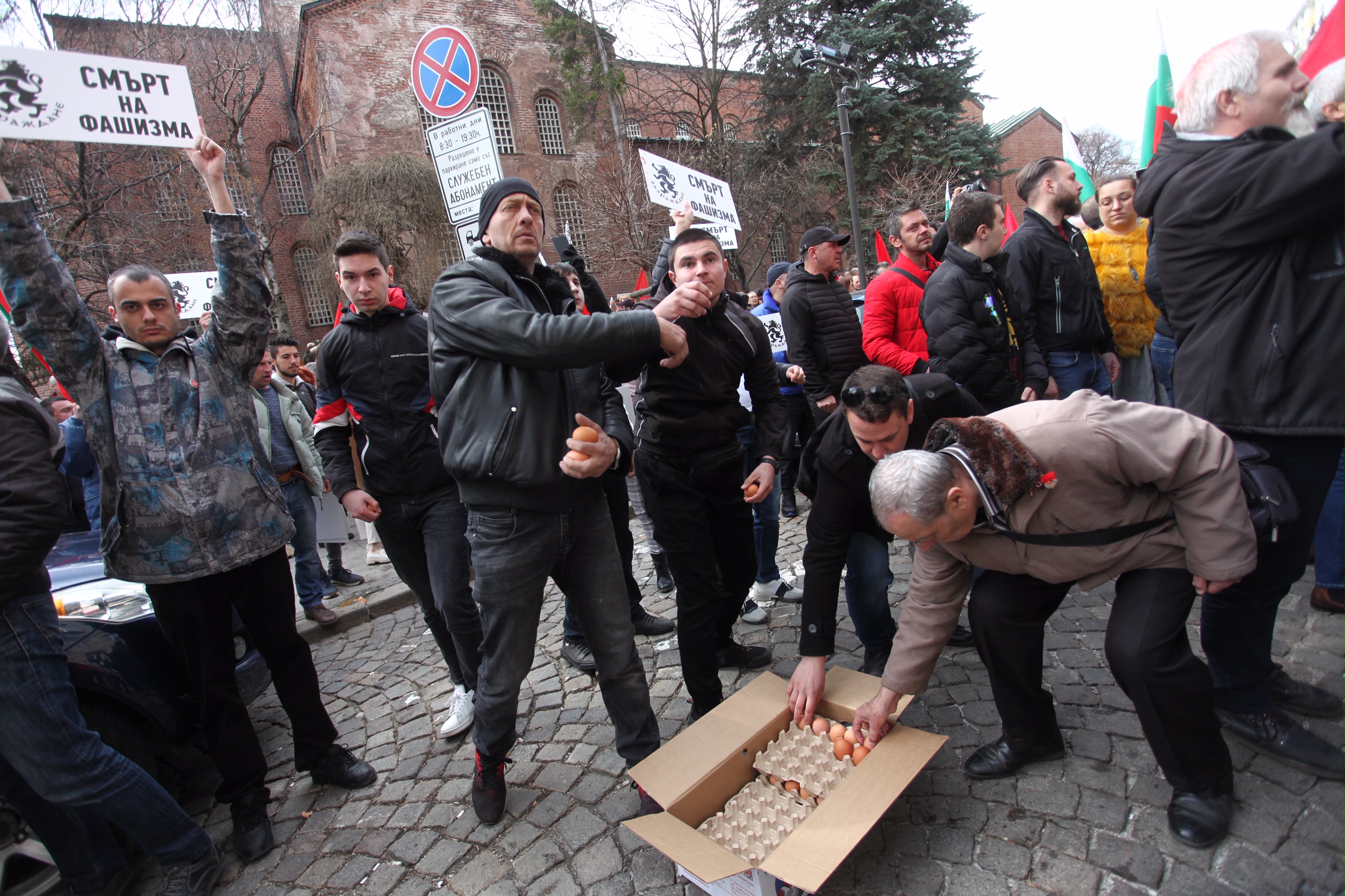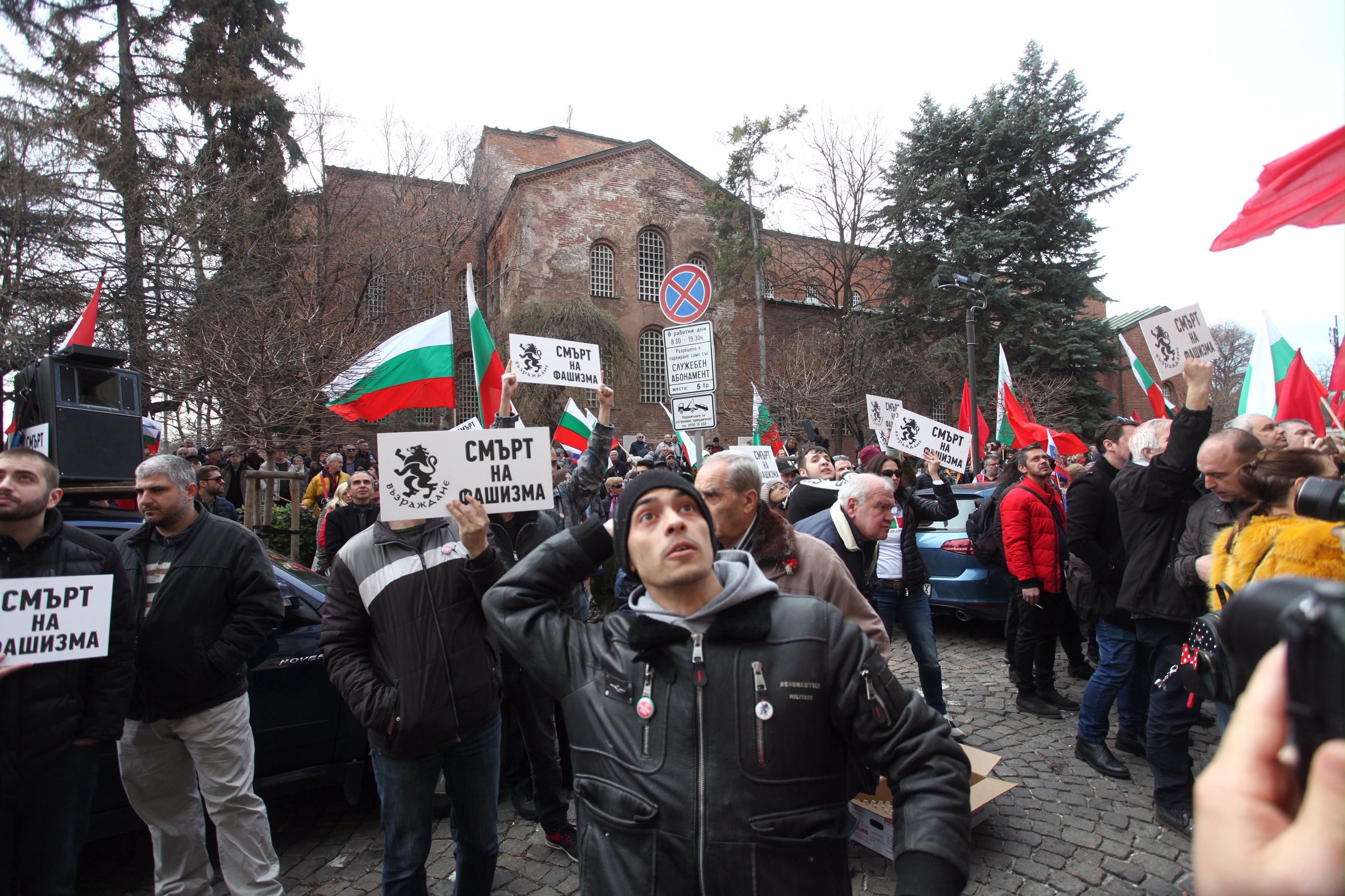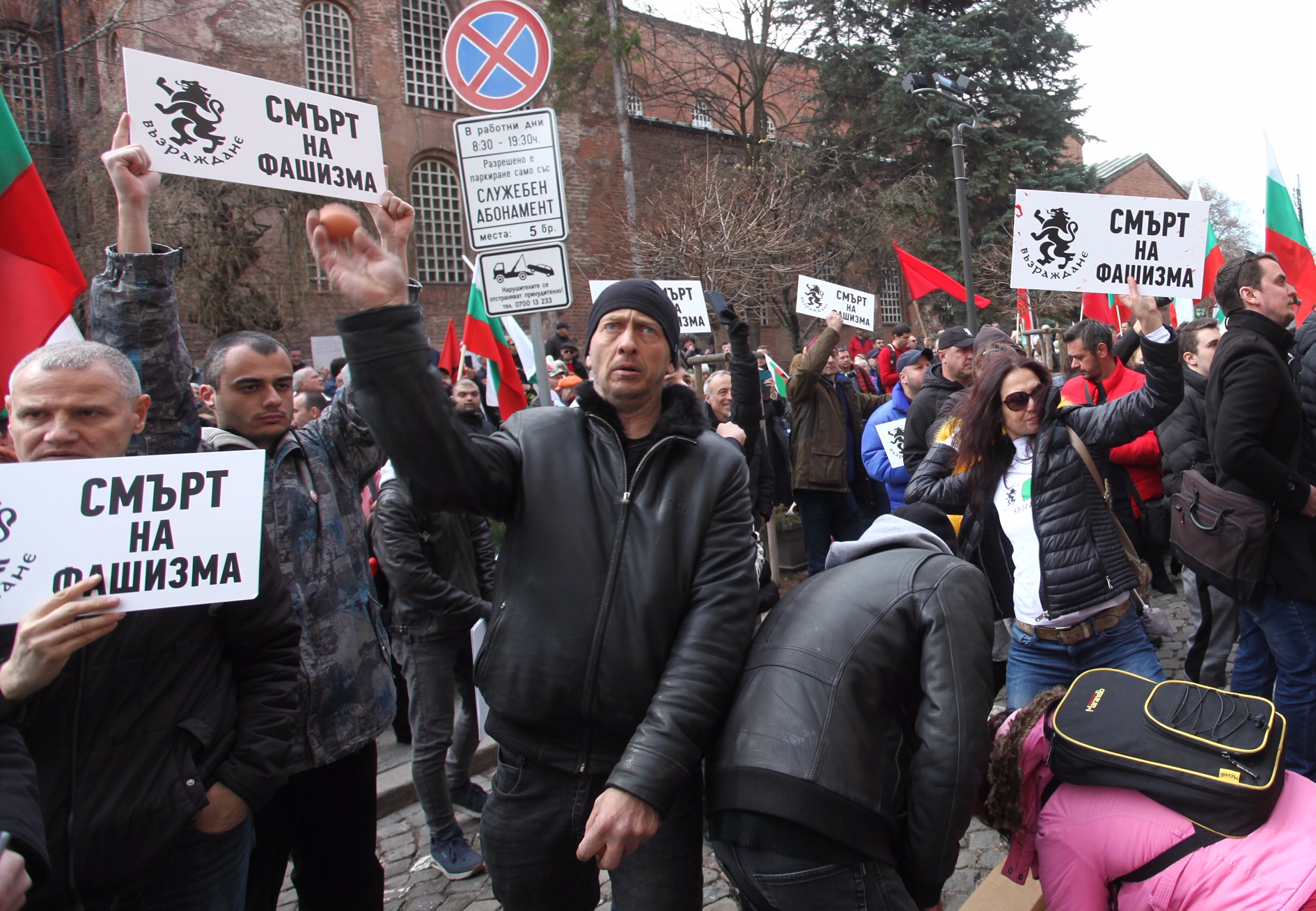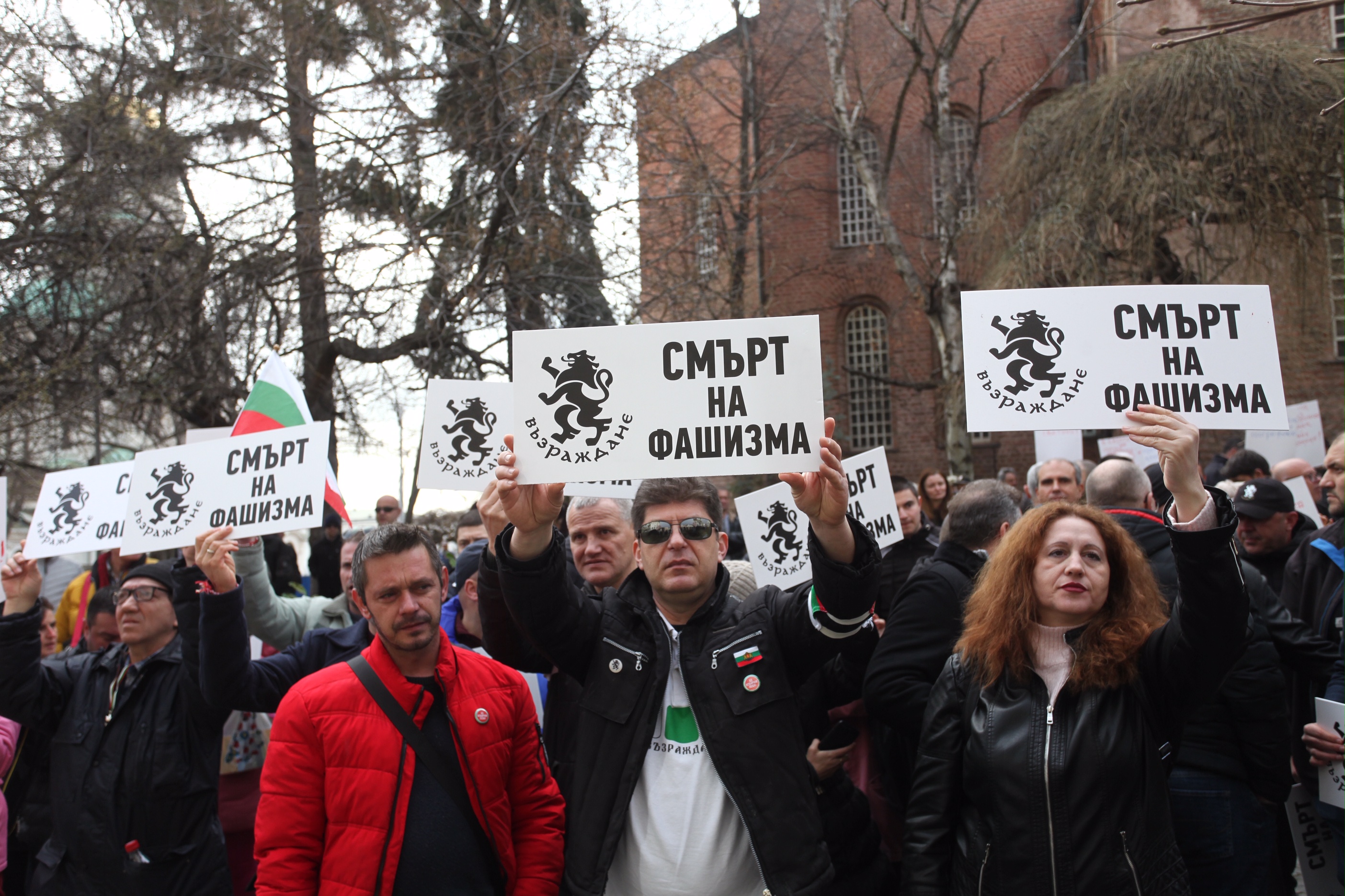 Представители на "Възраждане" държат плакати с надпис "Смърт на фашизма". Сред присъстващите са лидерите на "Атака" Волен Сидеров и на ПП МИР Симеон Славчев, предаде БТА.