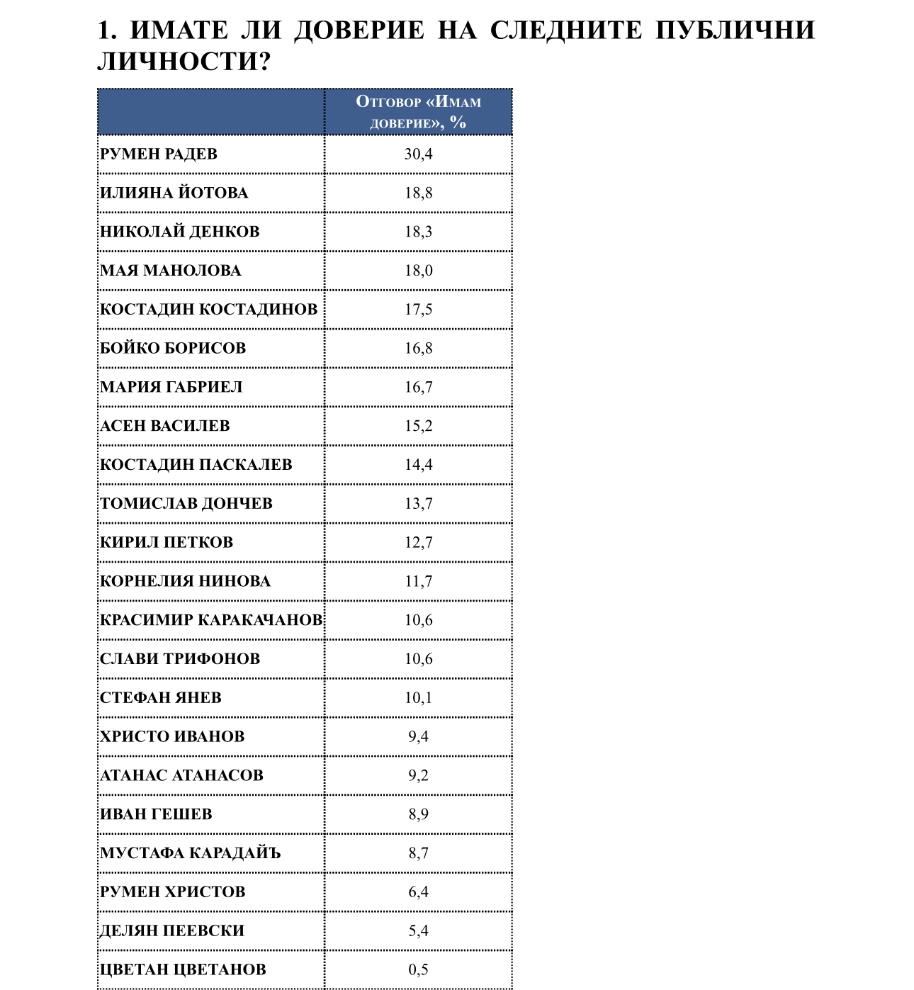 Ерозията в отношението към политическата система като цяло дава отражение и върху доверието към лидерите. Най-одобряваният политик у нас продължава да бъде Румен Радев (30,4%).