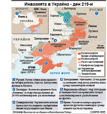 Около Лиман, бастион от другата страна на Донец, яростно защитаван от руските сили, украинците започнаха умела маневра за обкръжение с две предмостия на север и югоизток. Още по на север се води смъртоносна битка за контрола над Купианск, град, пресечен от Оскил. Притиснати, руските войски са в голямо затруднение, изтощени и деморализирани, посочва кореспондентът на френската агенция.