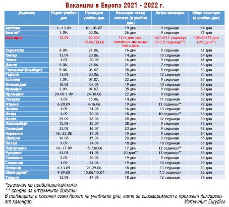 За сравнение средно за Европа през учебната 2021-2022 година ваканциите са общо 70 учебни дни, като 20 от тях са разпределени през учебното време. Най-малко почиват учениците в Германия и Дания - съответно 53 и 56 учебни дни. Под средното европейско равнище са още 16 държави. Най-близо до България е Румъния с 85 дни без учебни занятия.