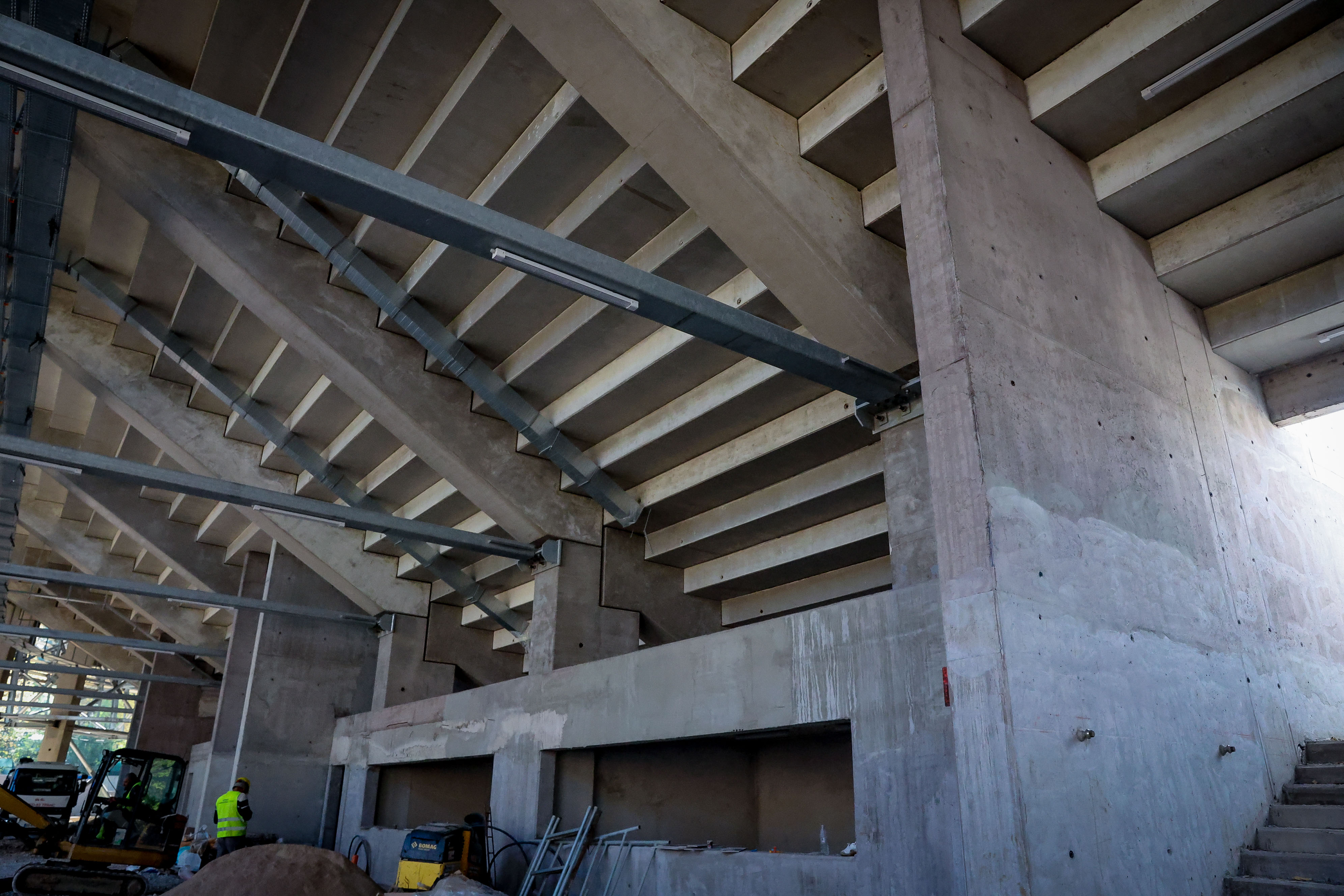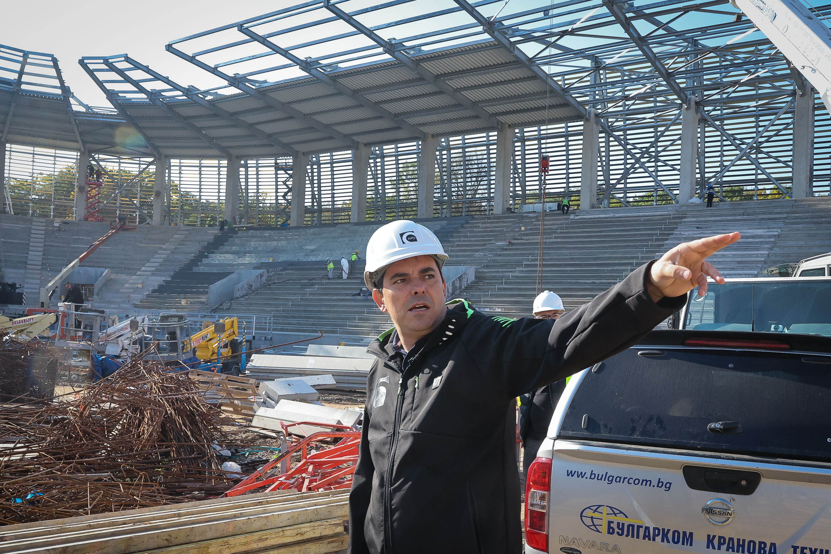 Докато седим на удобните седалки и си представяме как бихме гледали мач от тях, Ангелов ни сочи стоманена конструкция, сглобена на земята пред Сектор Б. Това е една от носещите конструкции на видео таблата. Те ще бъдат две, ще бъдат поставени под козирката и ще бъдат позиционирани така, че всеки зрител да може да вижда поне едно от тях, независимо от мястото си.