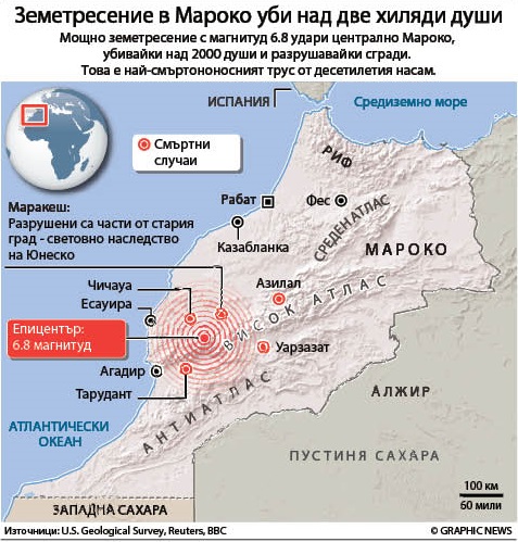 Броят на жертвите на мощното земетресение в Мароко е достигнал 2012 души, което го прави най-смъртоносното от десетилетия насам, предаде Ройтерс. Агенцията допълни, че ранените към момента са 2059. Епицентърът на мощното земетресение с магнитуд 6,8 според Геофизическия институт на САЩ е бил югозападно от град Маракеш, на 320 км южно от столицата Рабат.