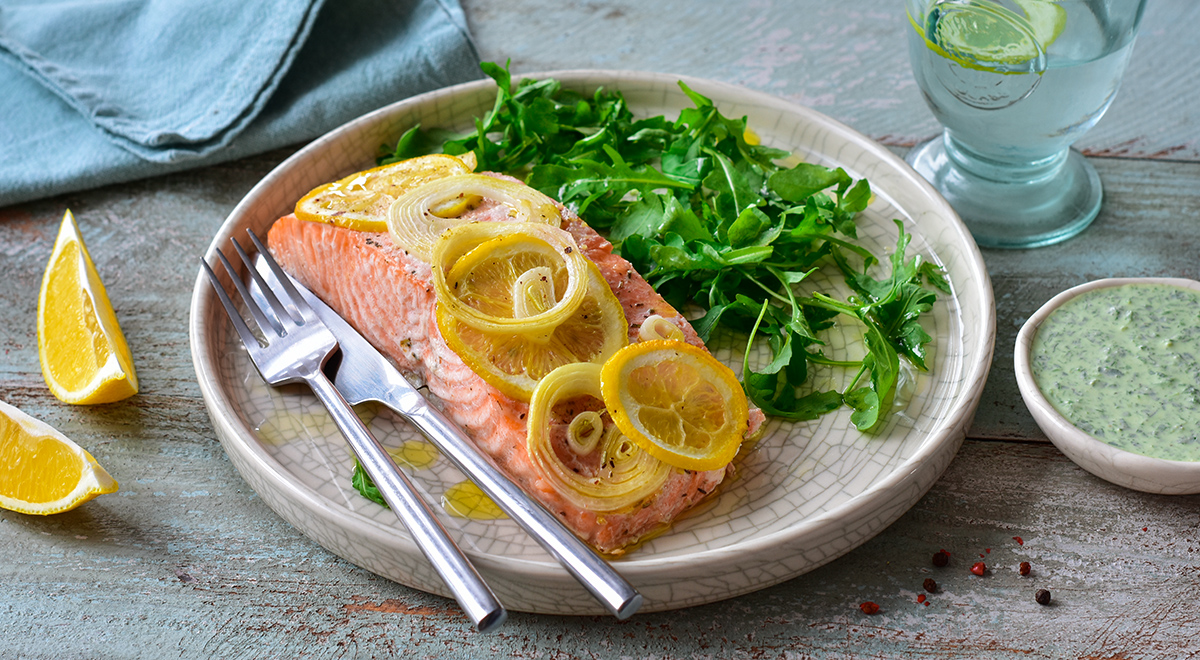 Нарежете лука на тънки колелца, лимона – на филийки. Филето от риба измийте и старателно подсушете с кухненска хартия. Посипете го с подправката за риба. Наредете върху него колелцата лук, поръсете сол и черен пипер. Върху лука подредете лимона. Завийте рибата във фолио, сложете в тава и печете на 180 градуса 40 минути. През това време направете соса. Руколата, естрагона и изчистения чесън смелете с блендер, посолете на вкус. Разтопете маслото в зехтина и на тънка струя го изсипете в пюрето от рукола, като разбърквате. Оставете сместа в хладилник най-малко за 30 минути. След това добавете сметаната в сместа и разбъркайте. Извадете рибата от фолиото върху чиния за сервиране. Поднесете заедно със соса и гарнитура по желание.