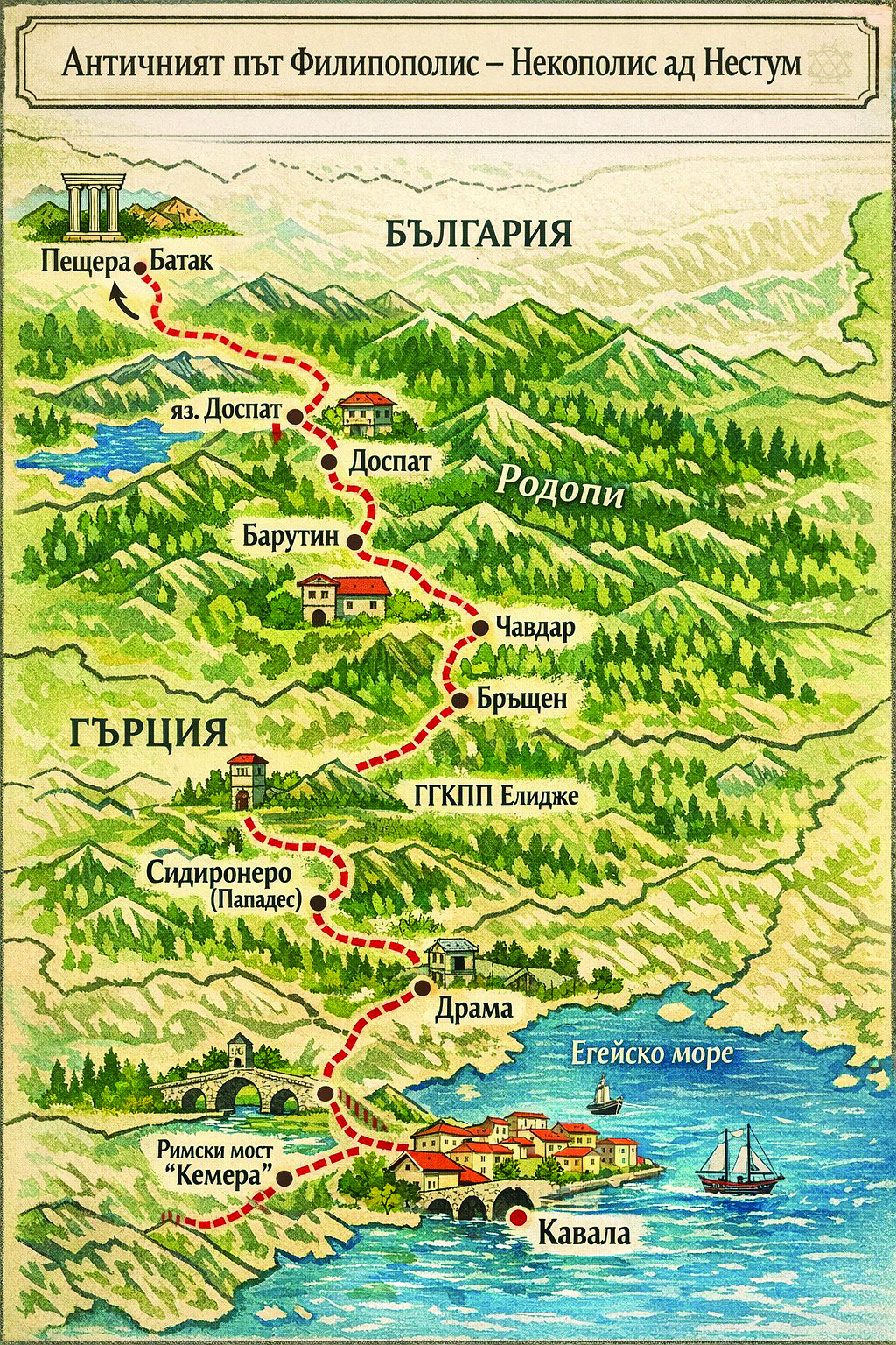 Но калдъръмът от римско време на места още стои. И римските мостове още са там. Ако погледнем топографска карта, ще видим нещо очевидно: от Барутин право на юг, през Чавдар и Бръщен, се излиза директно към Сидиронеро и Драма. Това е най-късата линия от вододела между централните и западните Родопи към Бялото море, използвана векове наред - докато една изкуствена граница не прекъсва естествени икономически и човешки връзки.