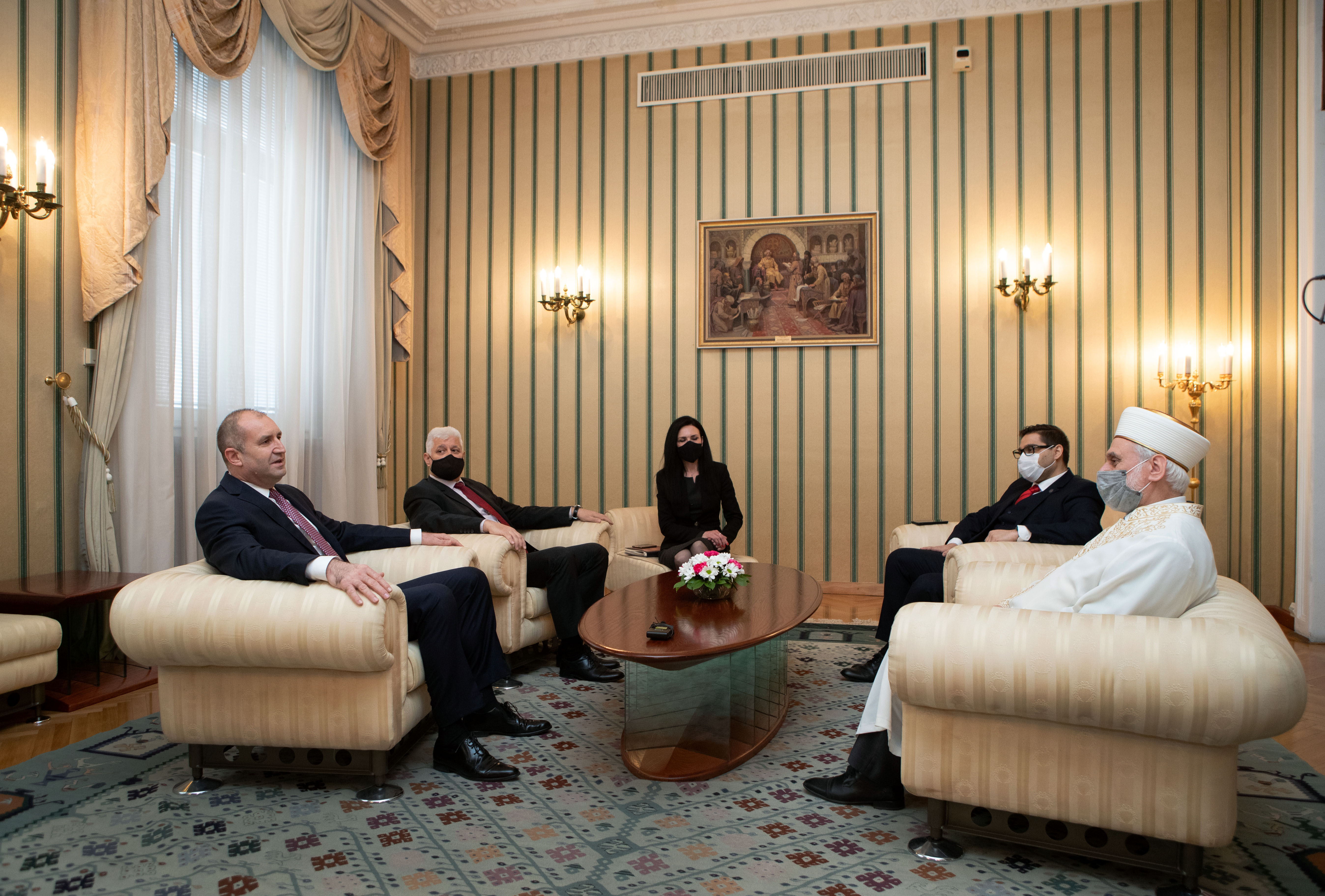 Главният мюфтия Мустафа Хаджи изрази удовлетворение от сътрудничеството и пълноценния диалог между вероизповеданията в България и изрази увереност, че равноправието и взаимното уважение между гражданите от различни вероизповедания у нас ще се съхраняват и утвърждават в бъдеще. Гостът изказа признателност от името на общността за инициативата на президента, довела до осъвременяване на законодателството, което да гарантира защита на традиционните български вероизповедания, така че да не се допуска радикализация. Главният мюфтия благодари и за уважението, което държавният глава демонстрира към традициите на мюсюлманската общност.