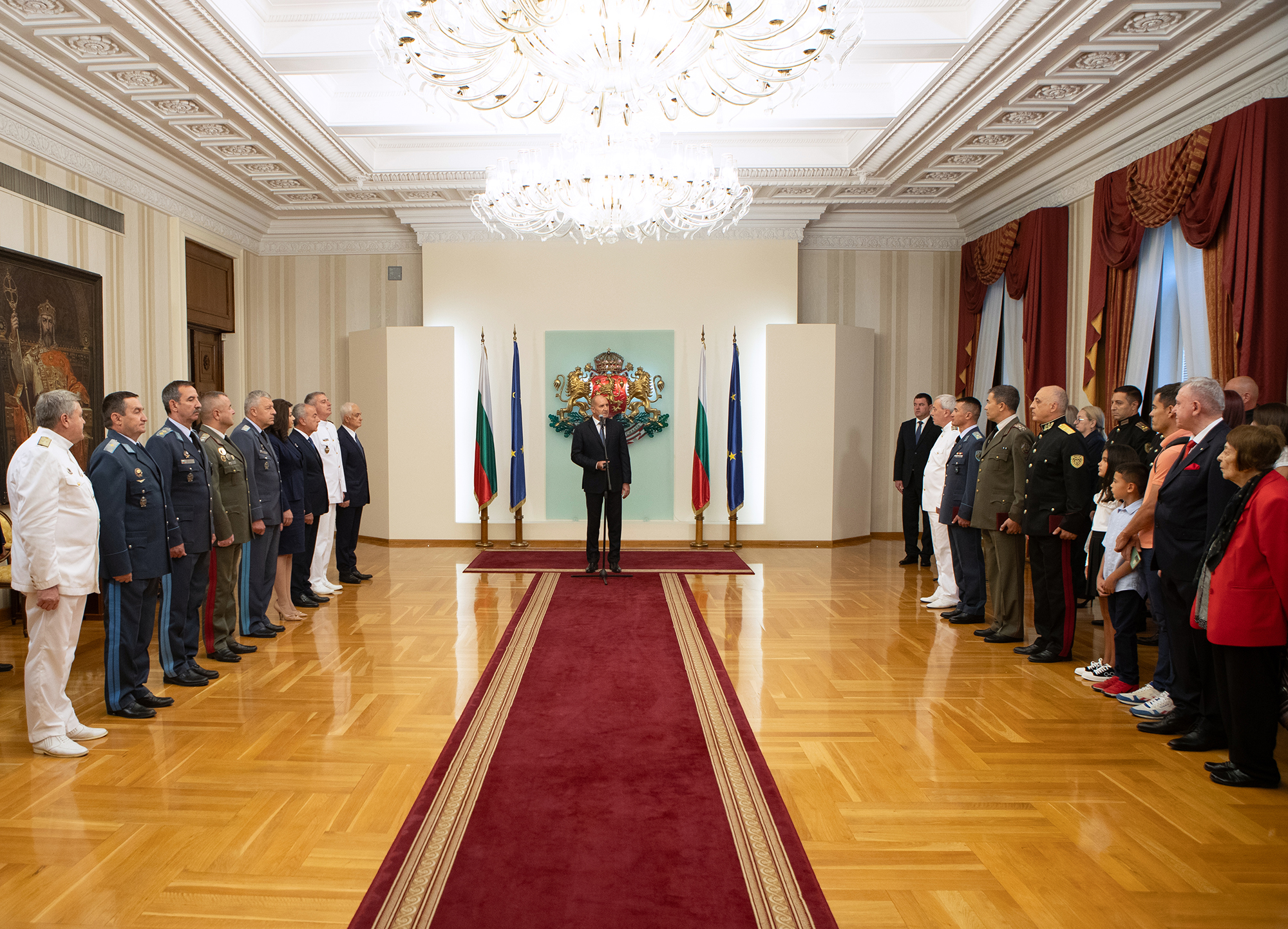 "През годините НСО се утвърди като важен фактор в системата за защита на националната сигурност и укрепване на държавния авторитет", заяви държавният глава Румен Радев, който връчи на церемония на „Дондуков“ 2 пагоните на четирима офицери, удостоени с висше офицерско звание.