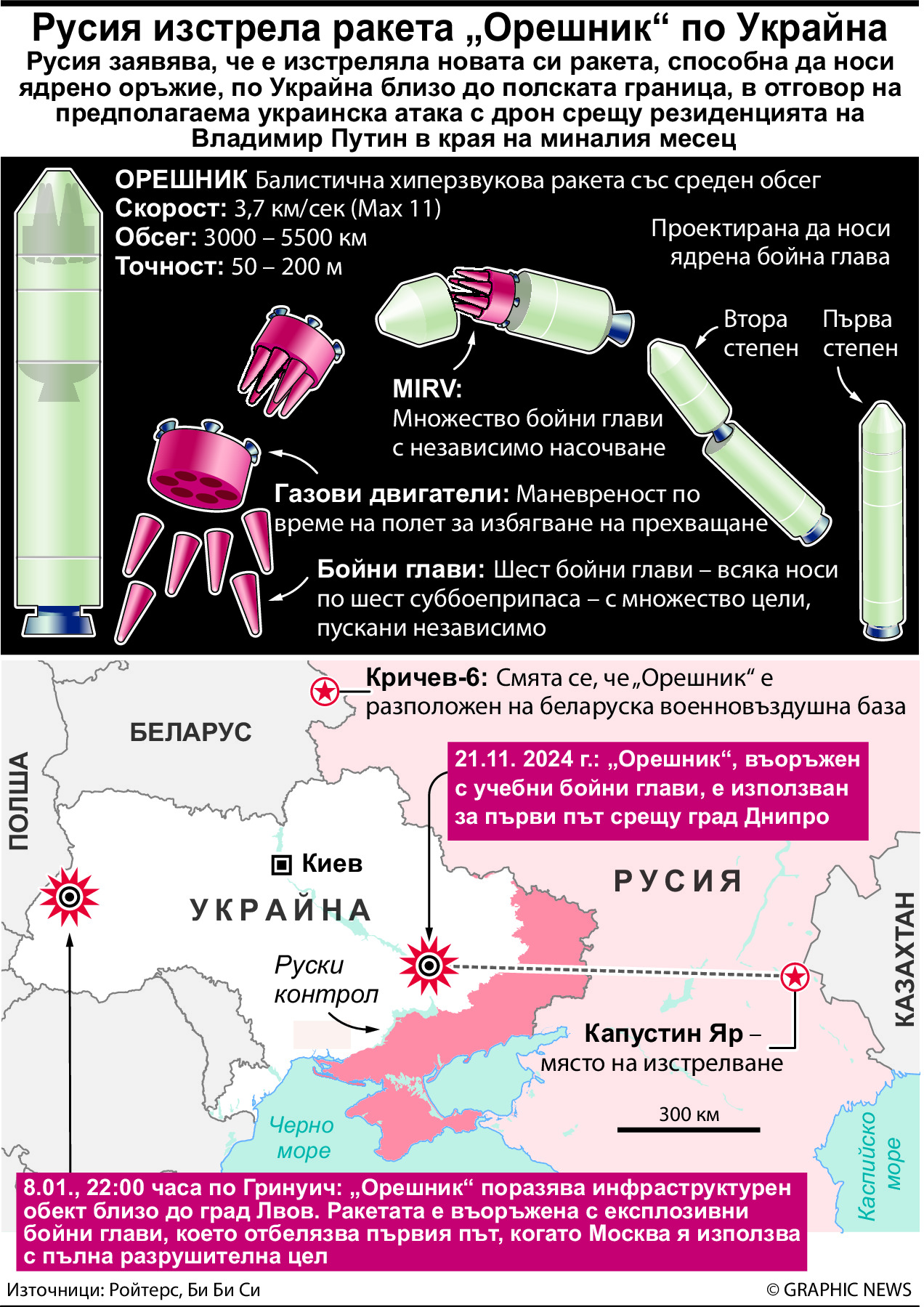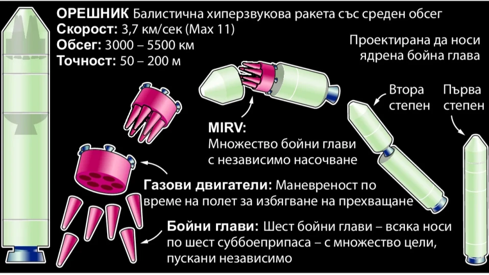 “Орешник” е балистична ракета със среден обсег, с потенциален обсег до 5500 км. Смята се, че носи бойна глава, проектирана да се раздели по време на финалното си спускане на няколко независимо насочени инертни снаряда, произвеждайки серия от близко разположени експлозии.