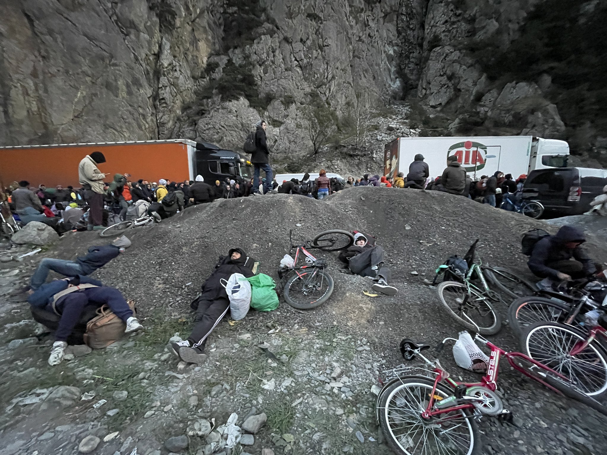 Руснаците преминаваха границата с коли, велосипеди, мотоциклети и пеша. Според Яндекс мапс във вторник задръстването по пътя към Верхни Ларс, град близо до границата между Грузия и Северна Осетия, е било с дължина около 15 километра.
