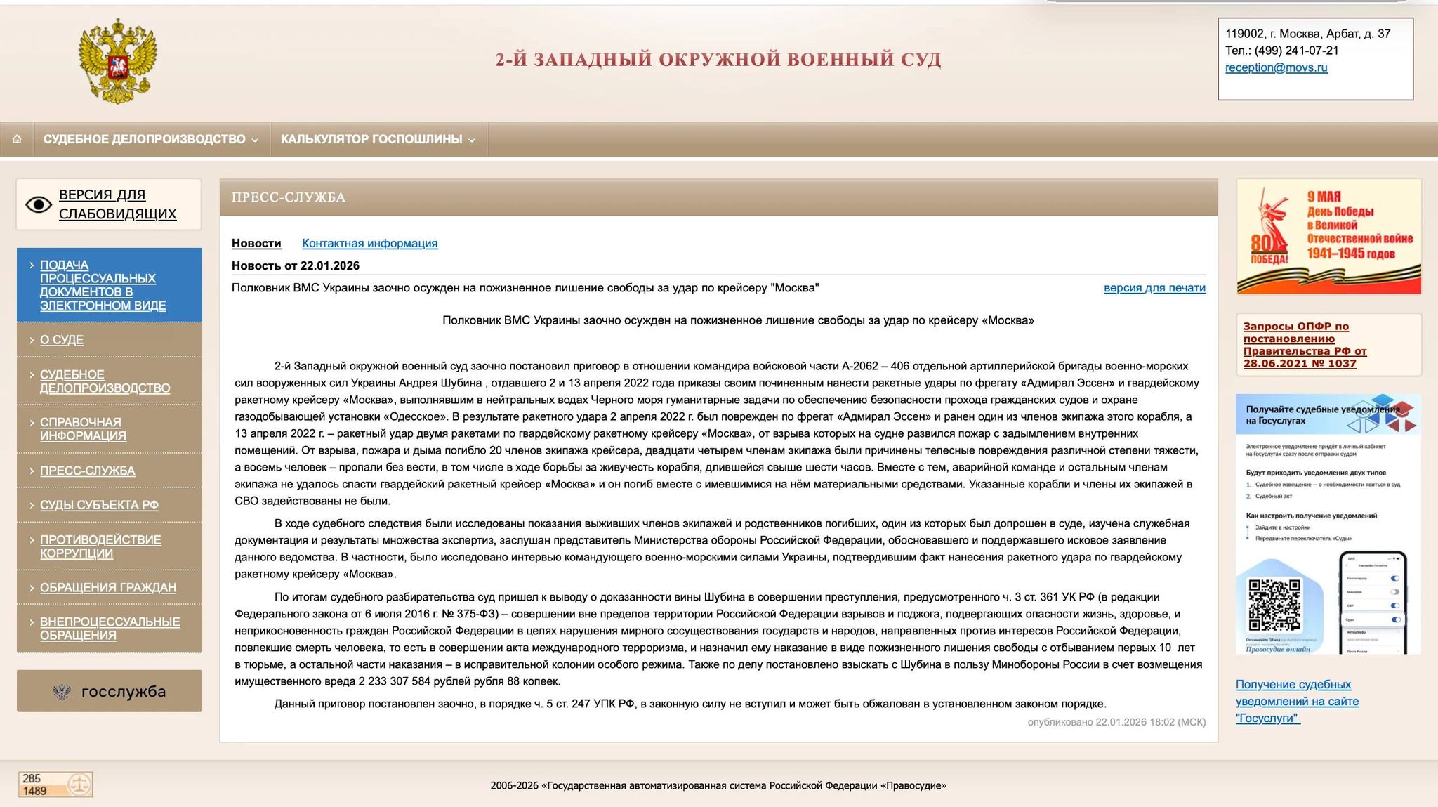 Военният съд признава за виновен за атаката командирът на 406-та артилерийска бригада на военноморските сили на Украйна, въоръжена с брегови ракетни комплекси РК-360МС "Нептун", полковник Андрей Шубин и го осъжда задочно на доживотен затвор. Налага му и глоба от 2,2 милиарда рубли.