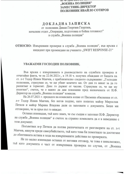 В докладната, която полк. Георгиев е внесъл в Президентството и в Инспектората на Министерство на отбраната в четвъртък, офицерът задава още множество неудобни въпроси за действията на Ивайло Сотиров. Въпросите разкриват как и.д. директор на „Военна полиция“, е намерил начин да стовари цялата вина на един млад военнослужещ, което в крайна сметка приключва с неговата смърт. Парадоксът е, че разследването на Тодор Манчев също се води от „Военна полиция“, чийто и.д. началник Ивайло Сотиров е изключително близък с президента Румен Радев.